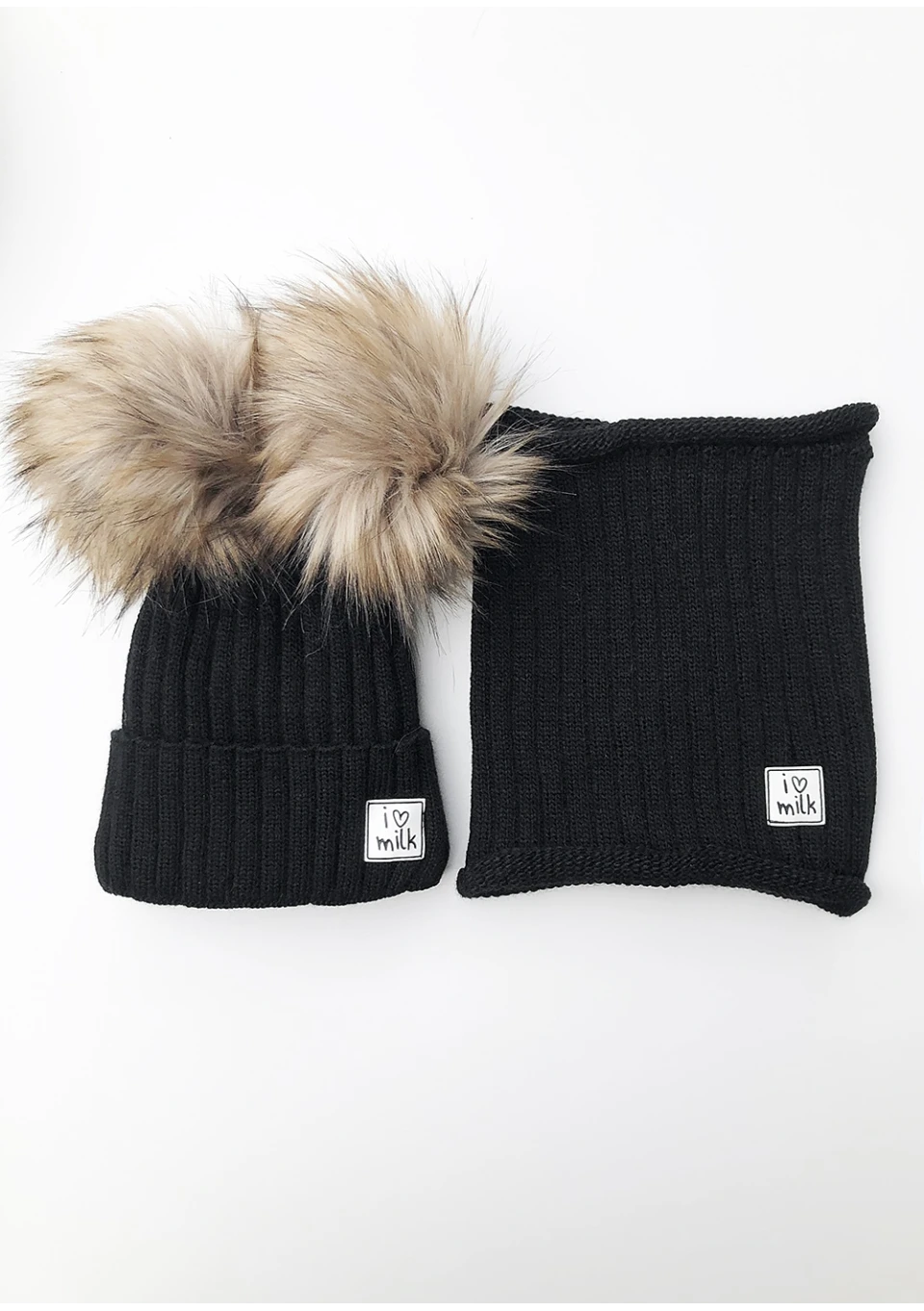 Kids black winter beanie with pompoms
