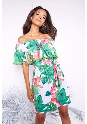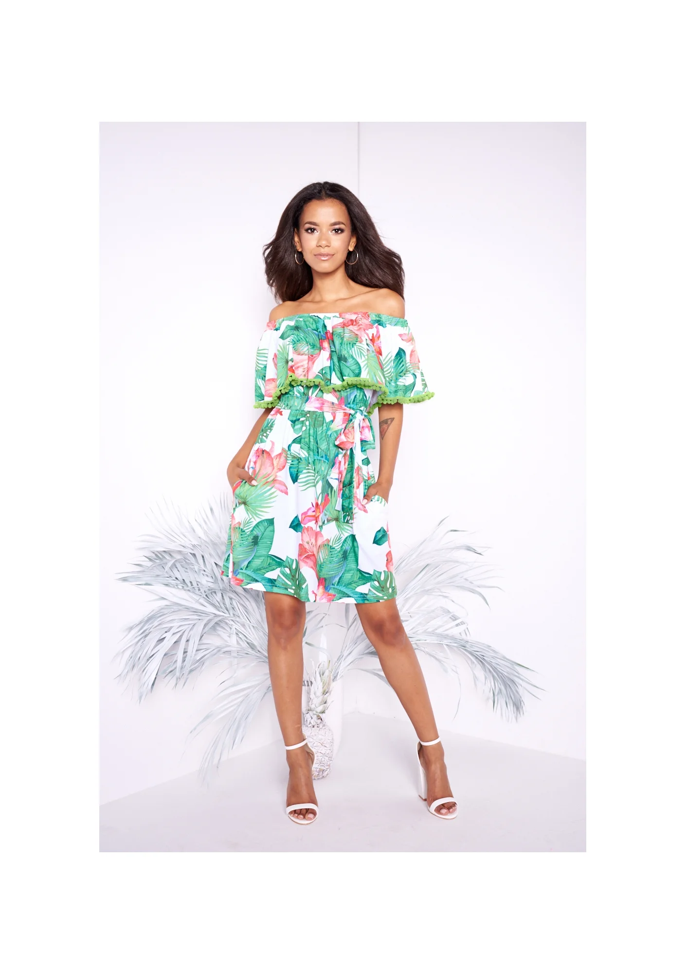 WHITE DRESS IN EXOTIC FLOWERS PRINT WITH POMPOMS