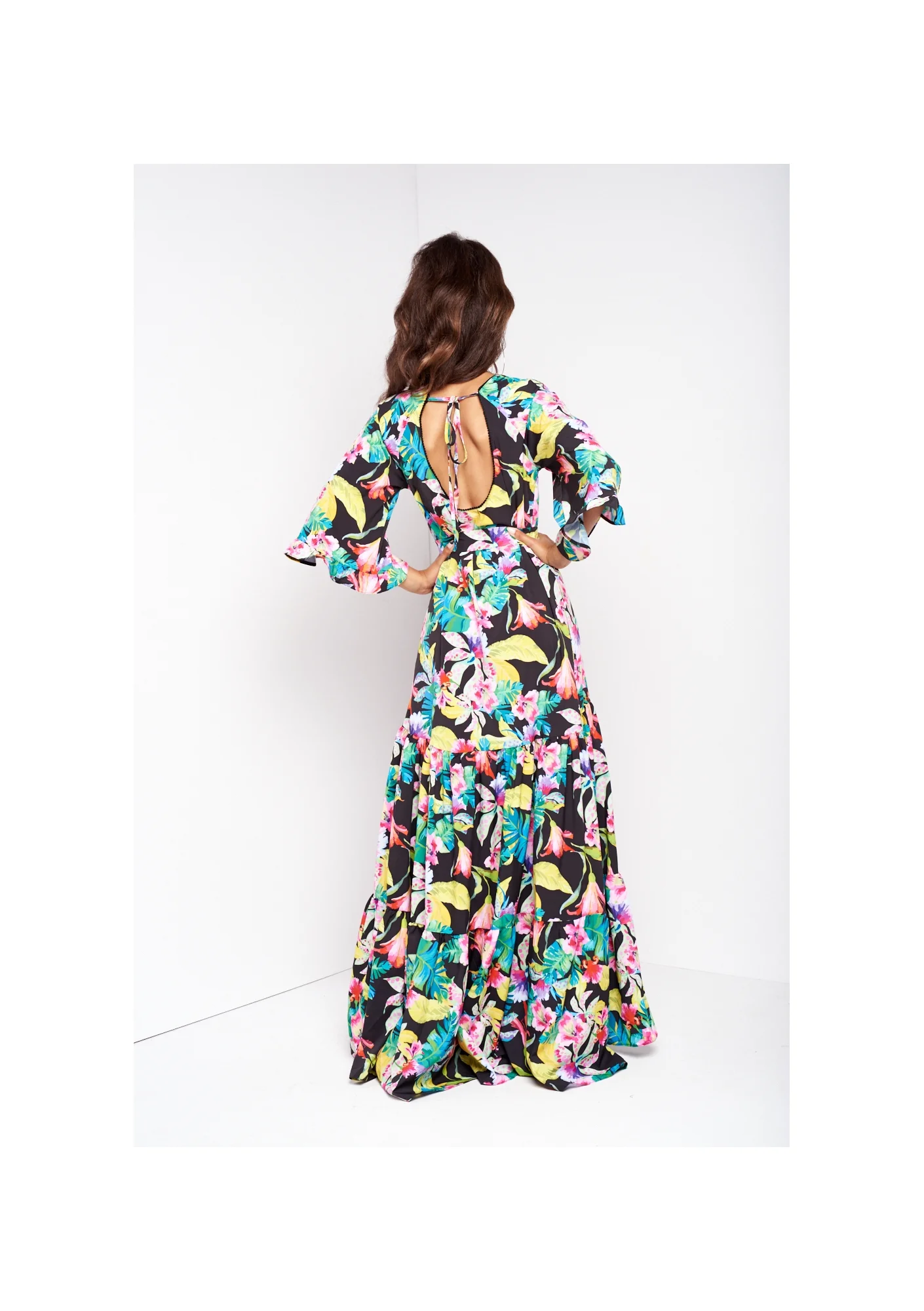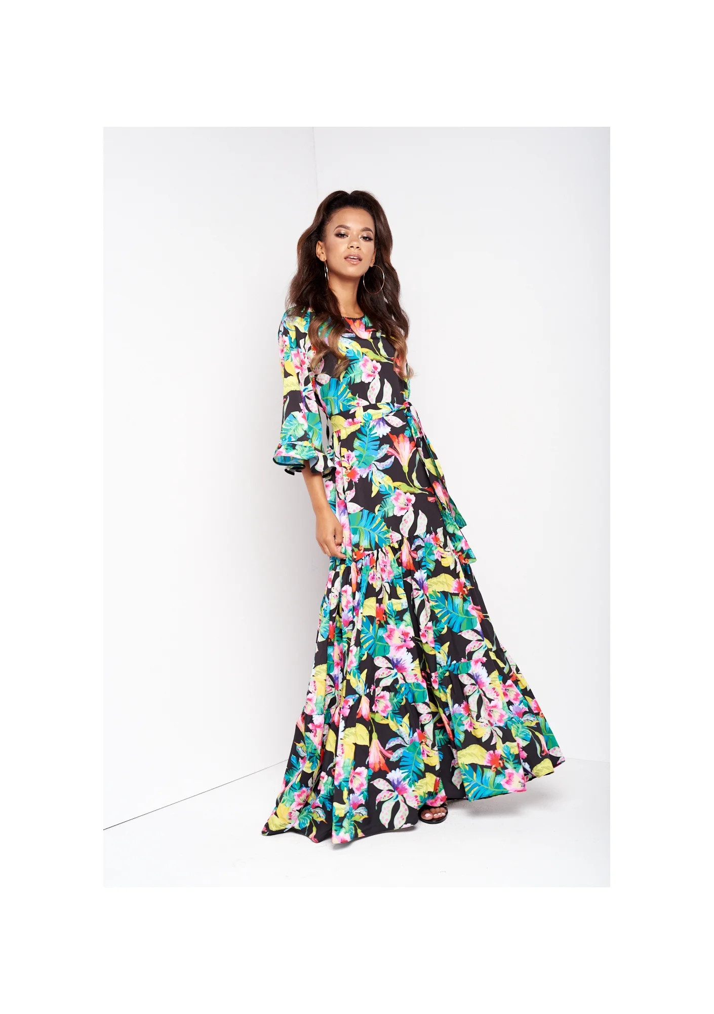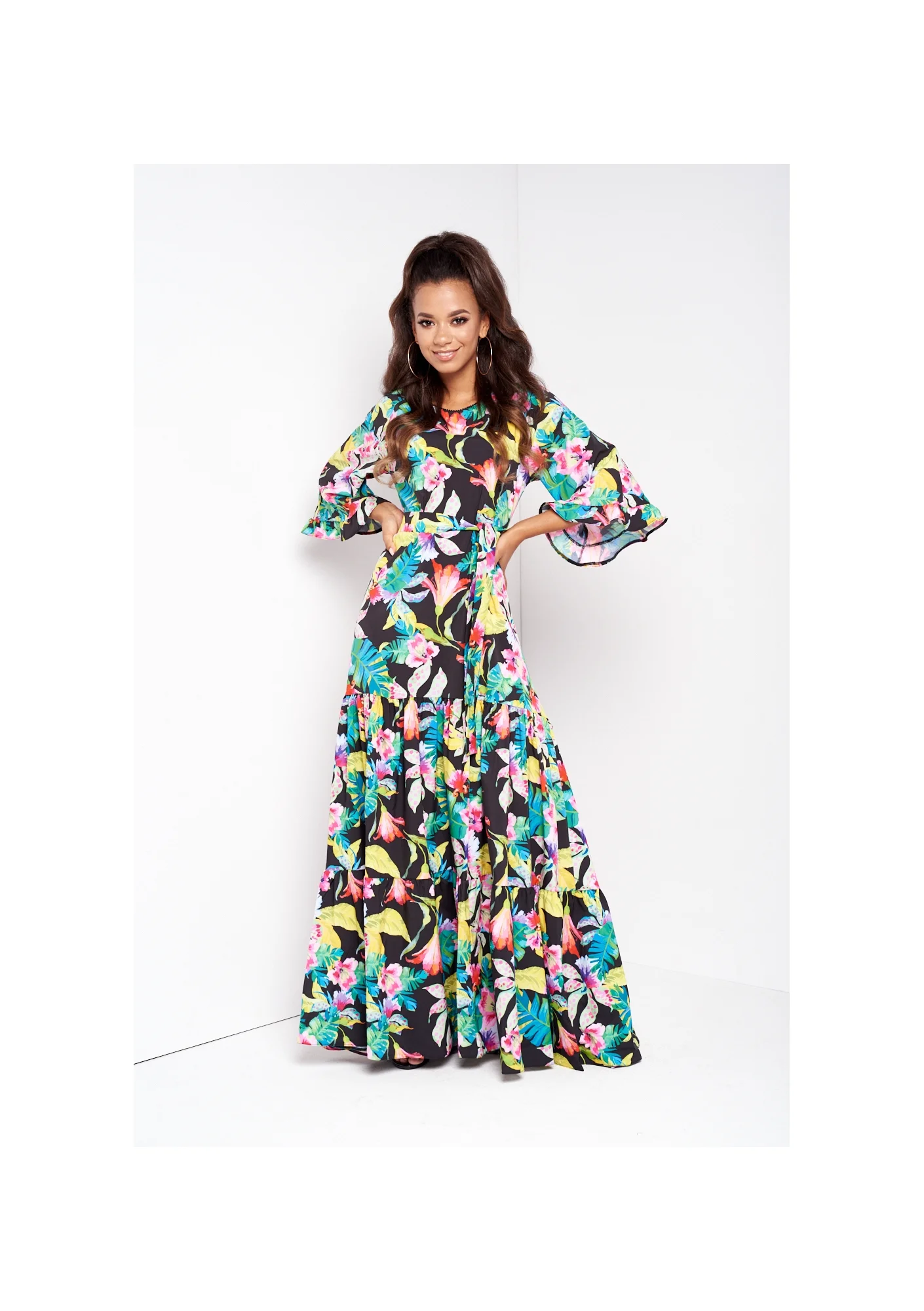 BLACK EXOTIC FLOWERS PRINT MAXI DRESS WITH BELT