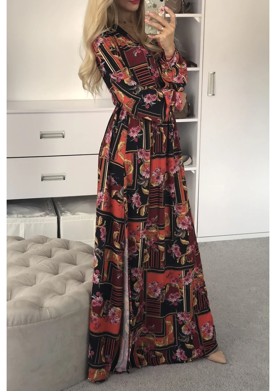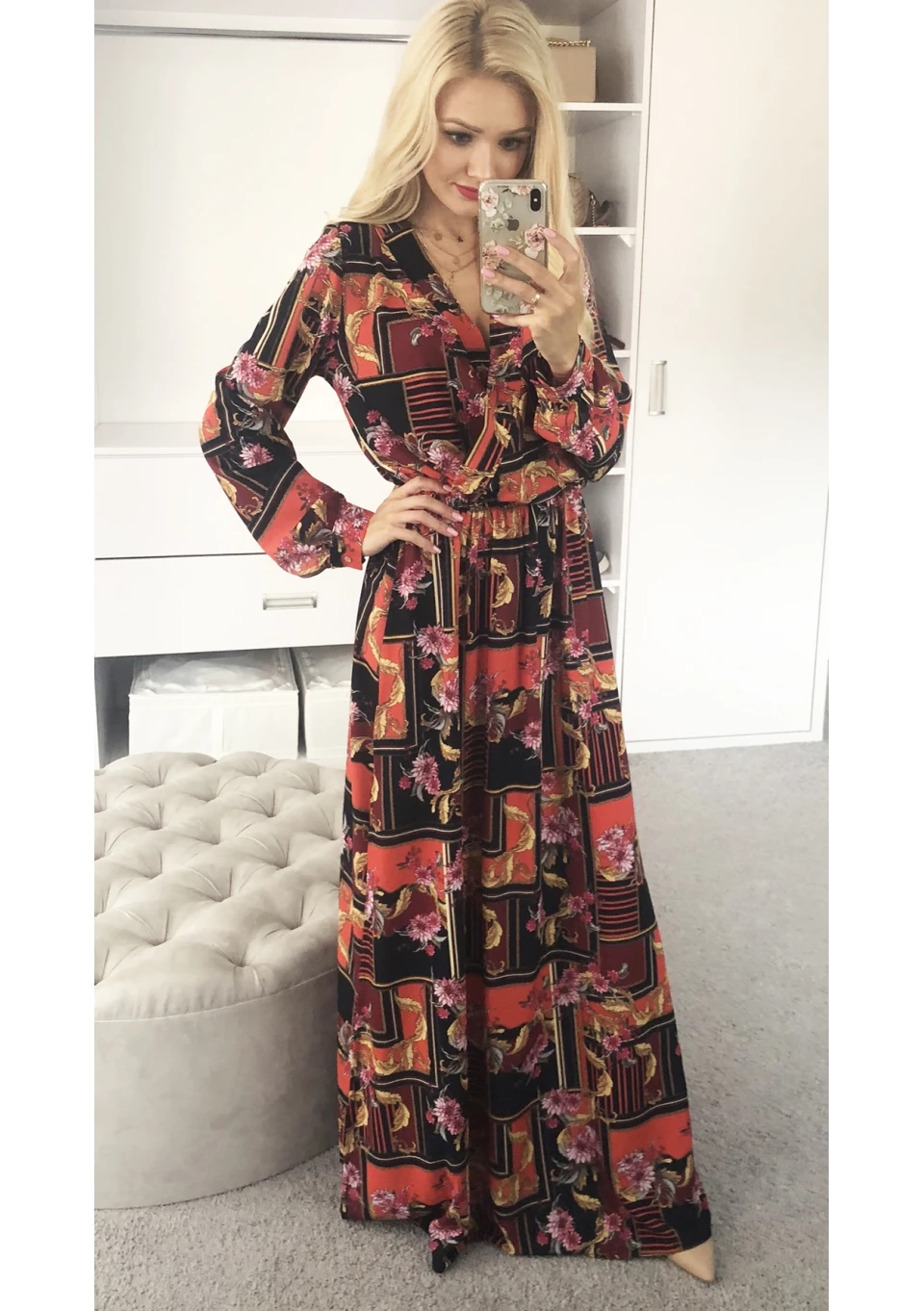 CROSSOVER MAXI DRESS IN RED ORNAMENT PRINT