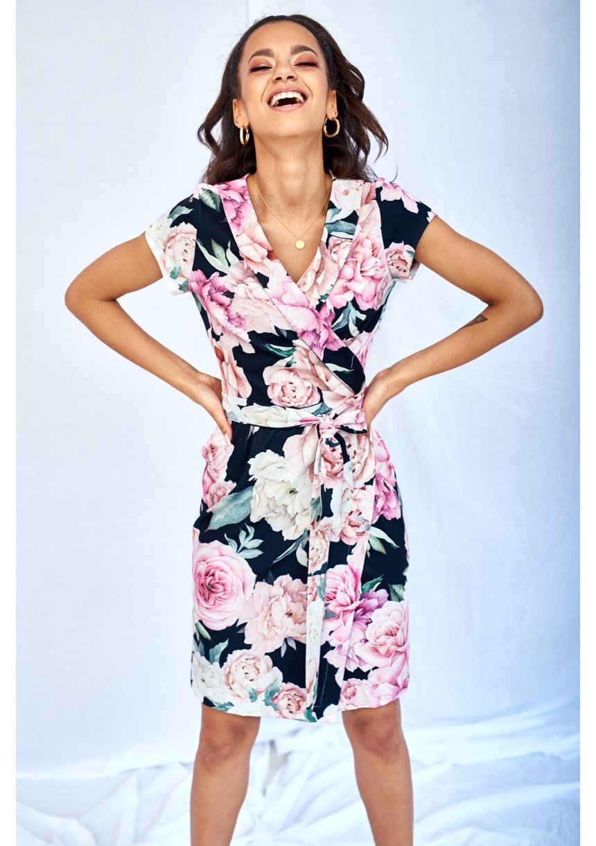 BLACK CROSSOVER DRESS IN ROSES PRINT