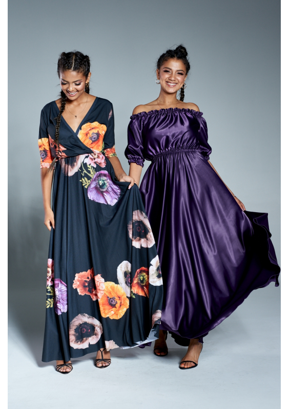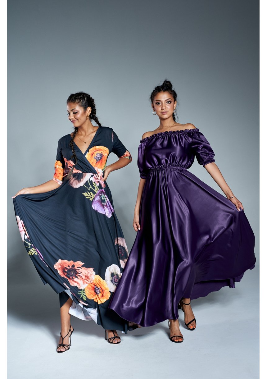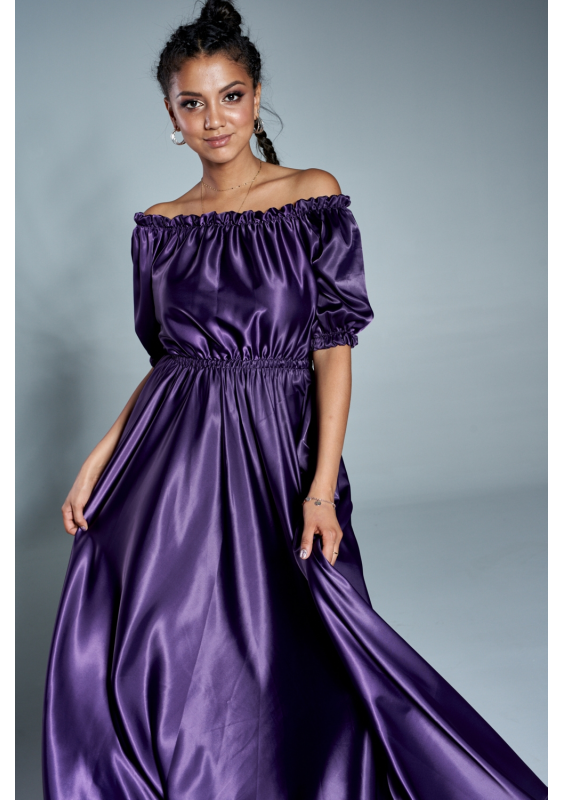 SATIN MAXI OFF SHOULDERS DRESS IN PURPLE COLOR