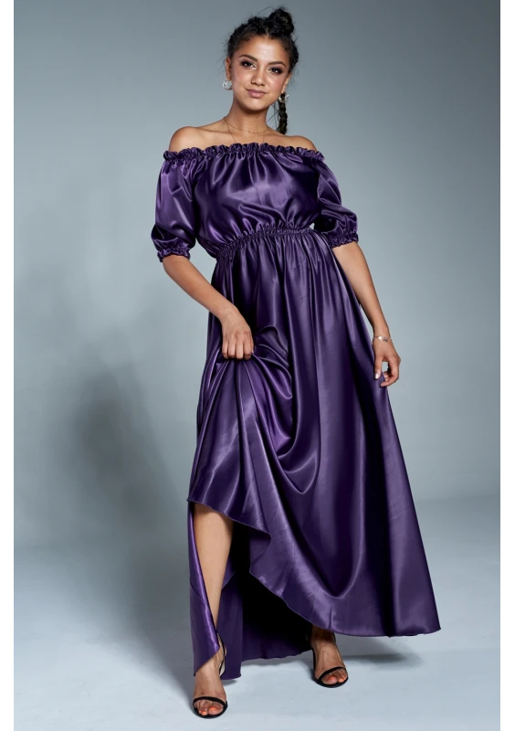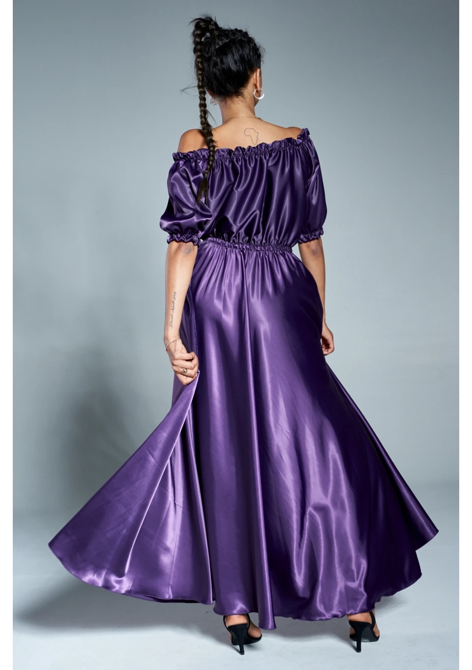 SATIN MAXI OFF SHOULDERS DRESS IN PURPLE COLOR