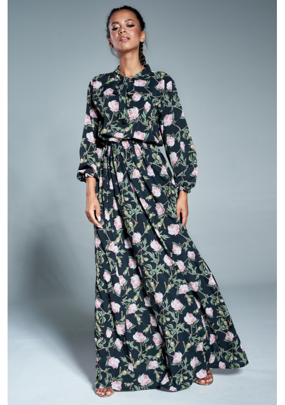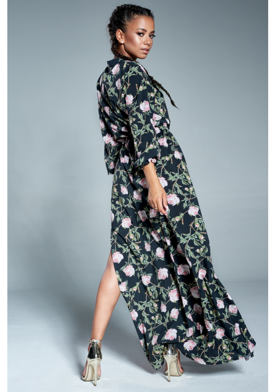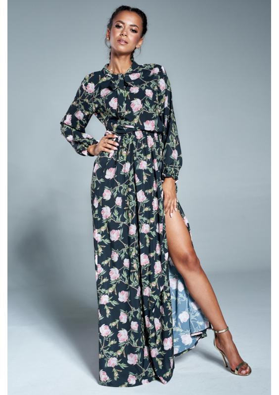DARK GREEN MAXI DRESS IN FLOWERS PRINT