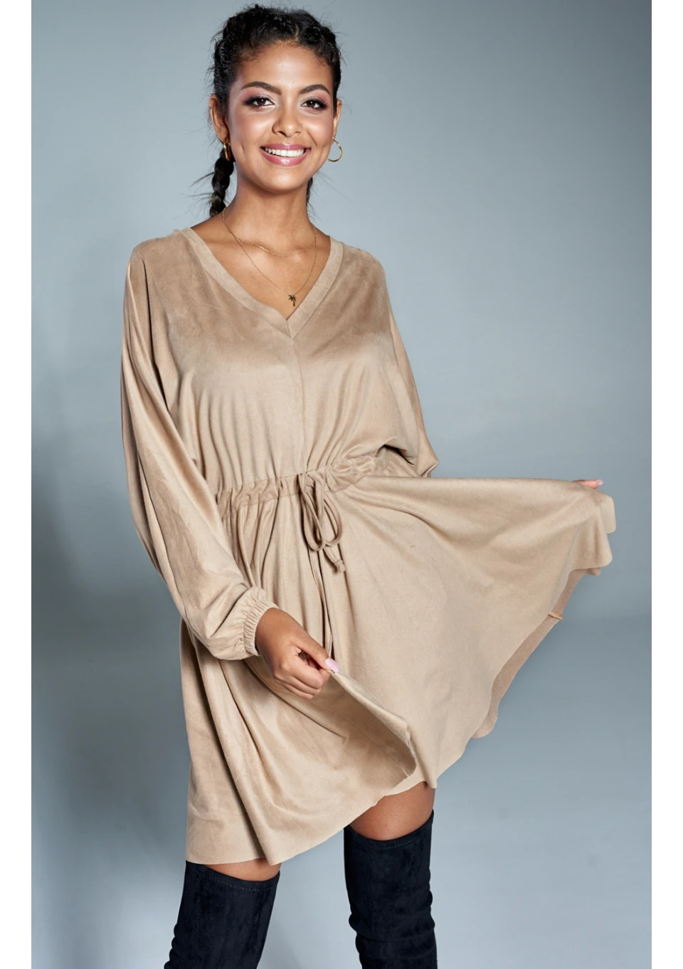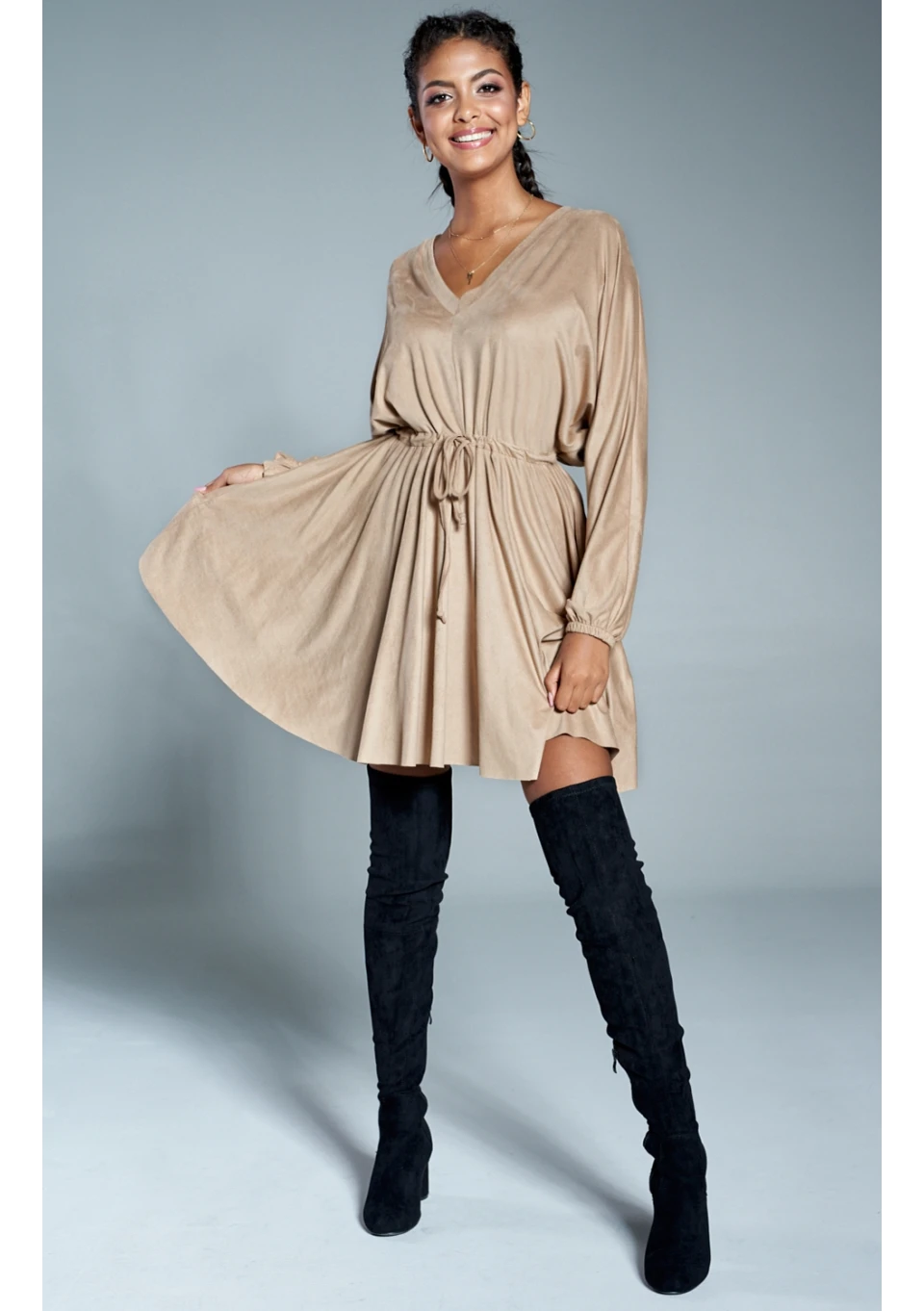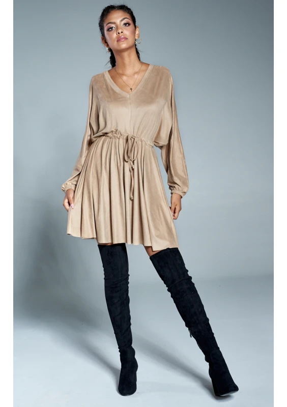 SUEDE V-NECK DRESS IN BEIGE COLOR