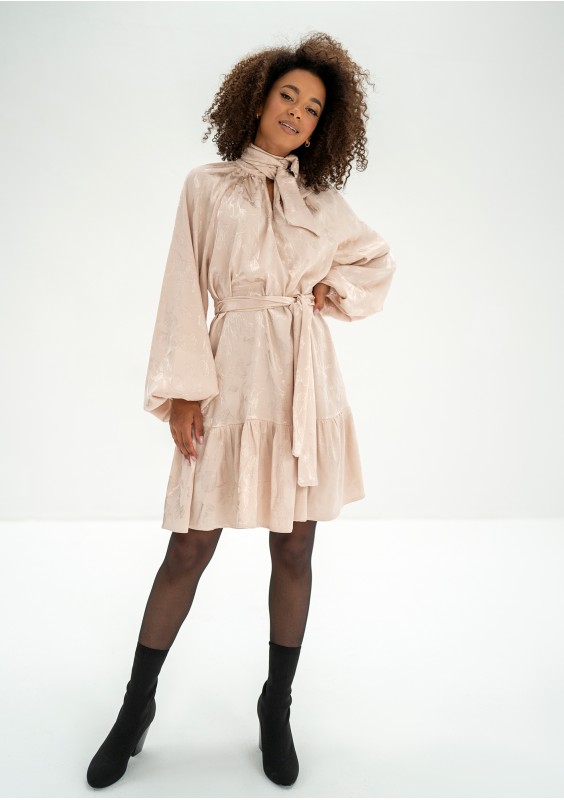 - Beige frilled jacquard rayon dress