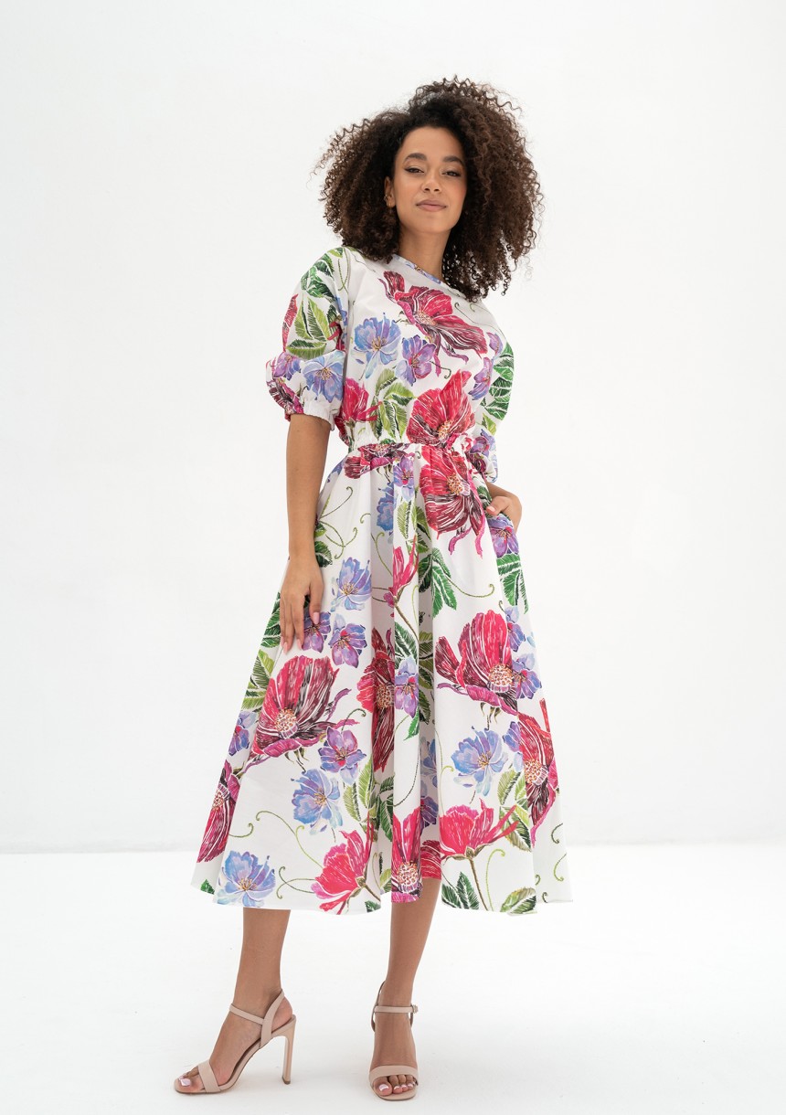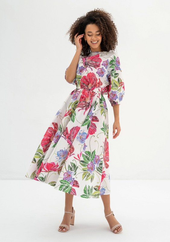 Mabel - Ecru floral flared midi dress