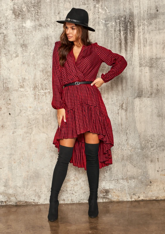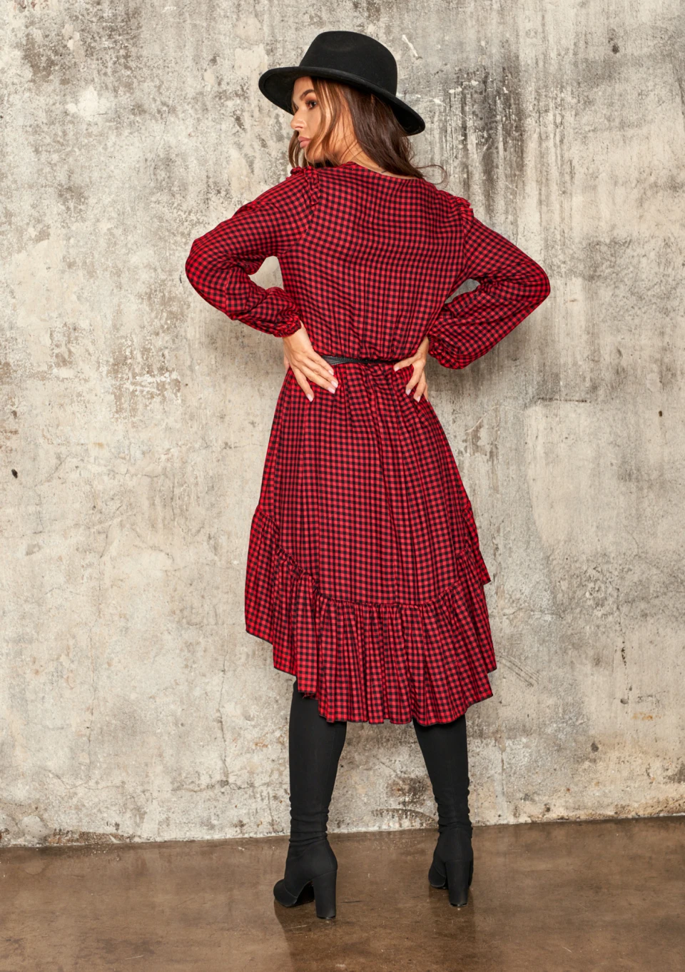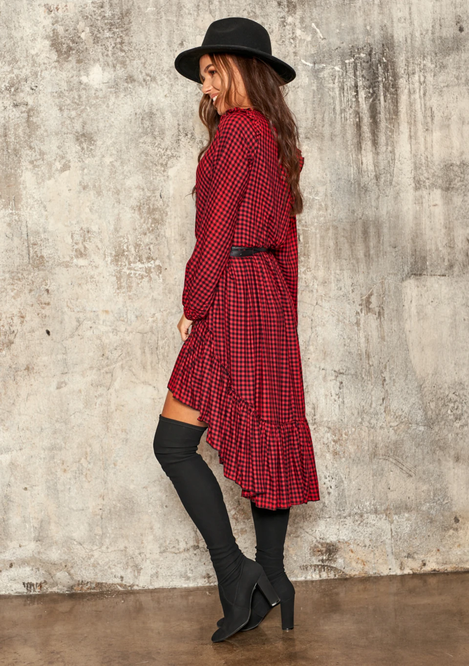 VISCOSE ASYMMETRIC DRESS IN RED CHECK PRINT