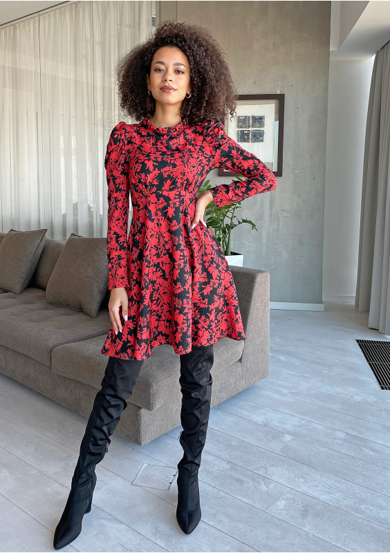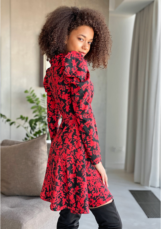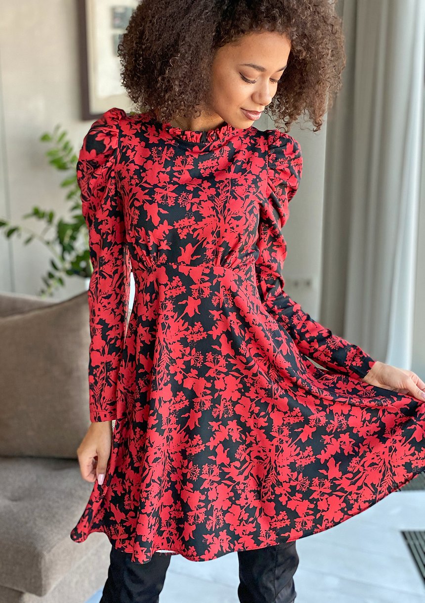 RED PRINT DRESS WITH PUFF SHOULDERS