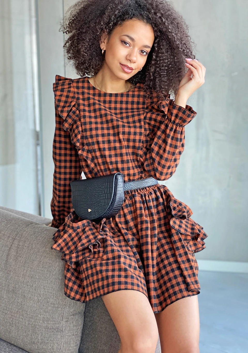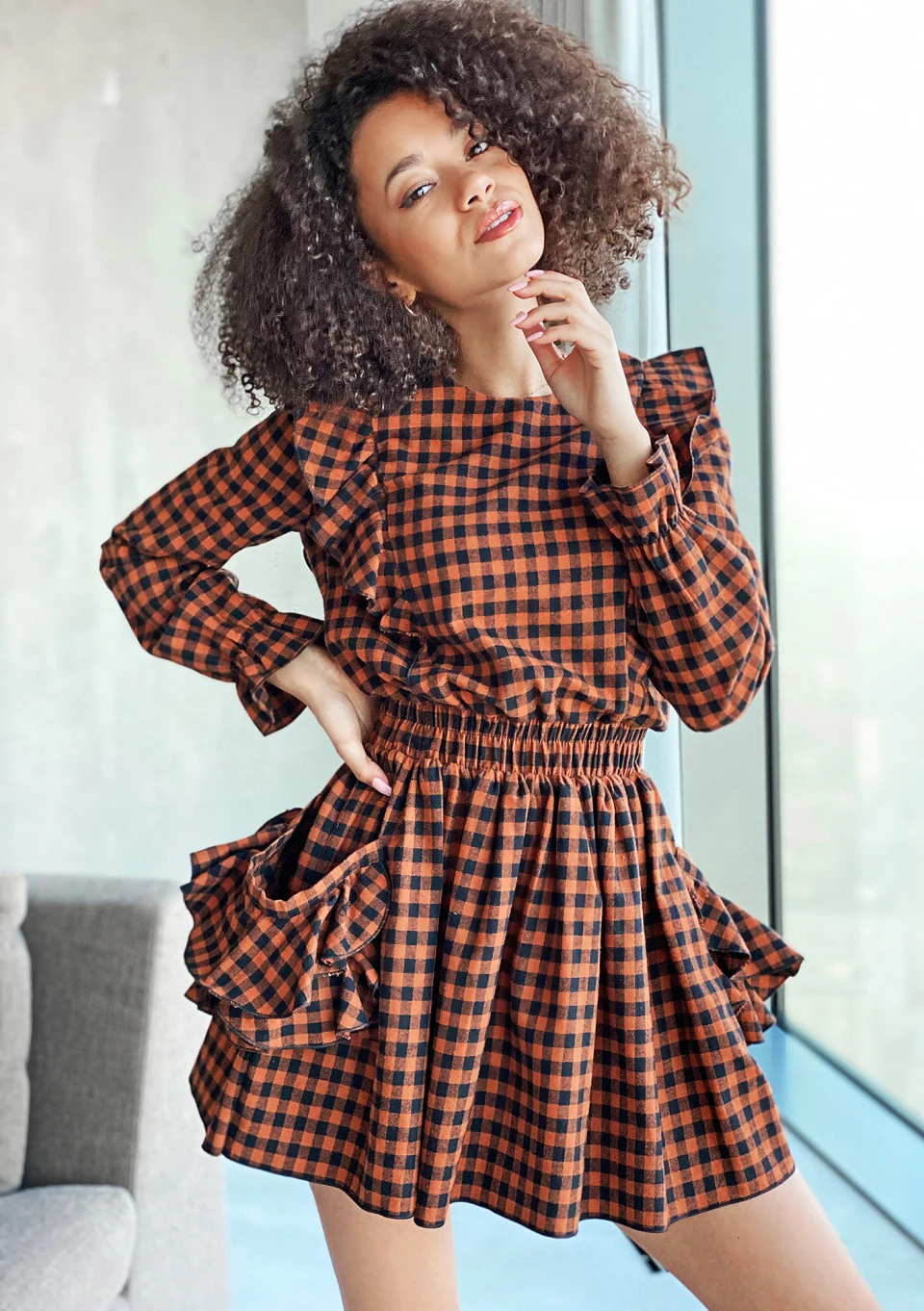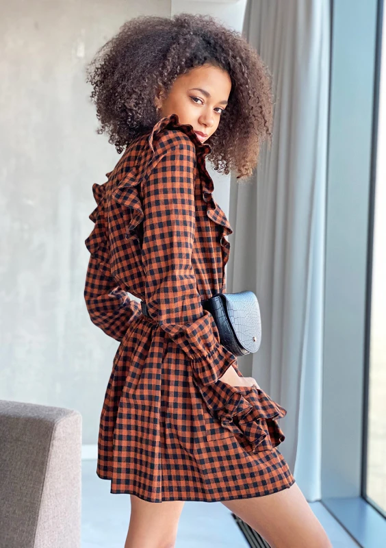 BROWN CHECK DRESS WITH FRILLS