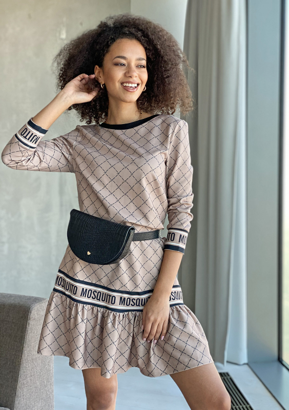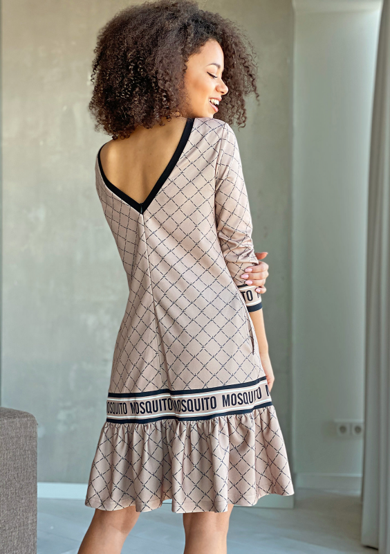 BEIGE LOGO PRINT DRESS WITH FRILL
