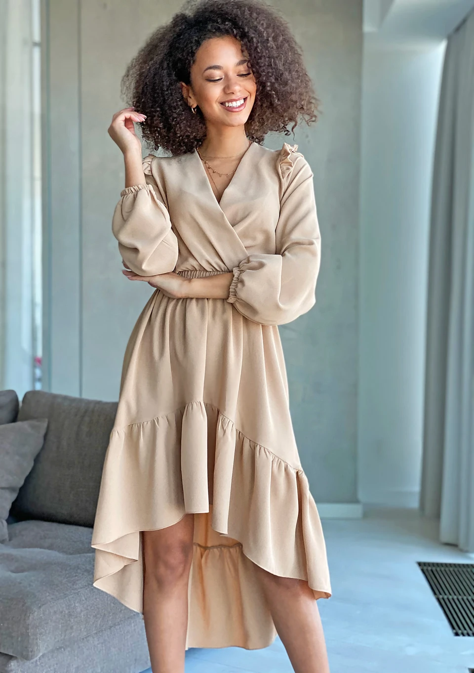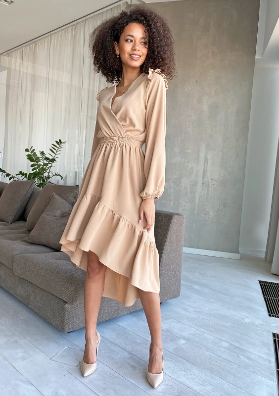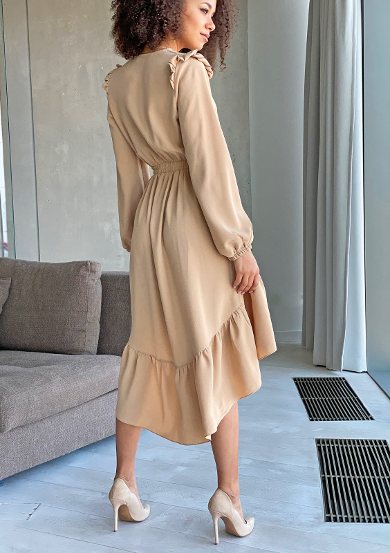 BEIGE ASYMMETRIC DRESS WITH FRILLS