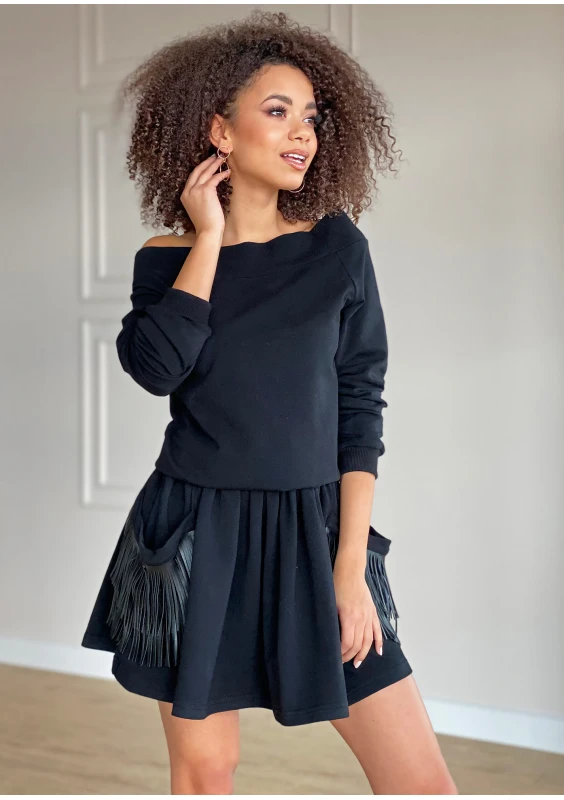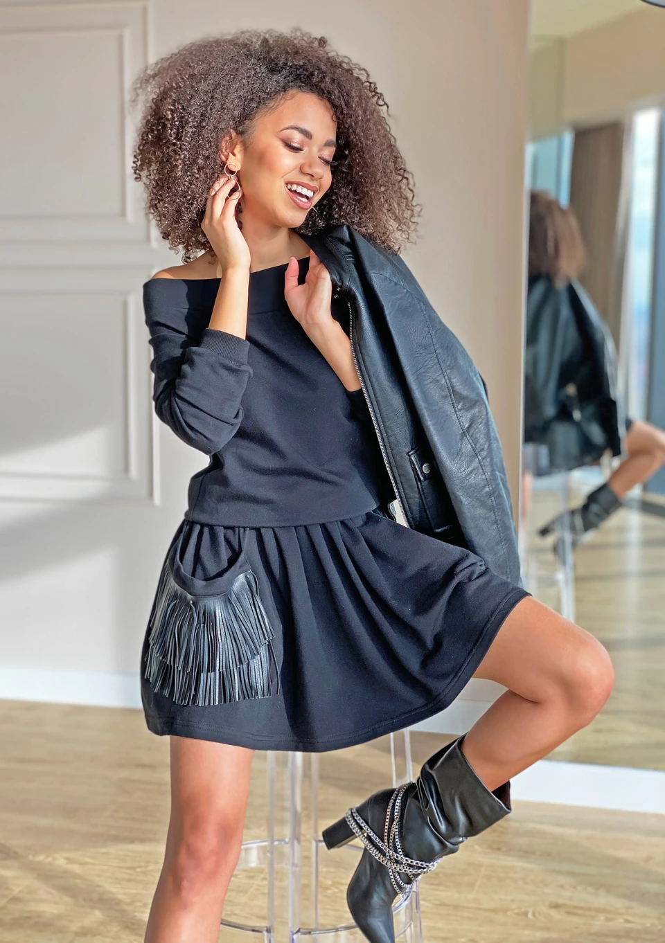 BLACK MINI DRESS WITH FRINGE POCKETS