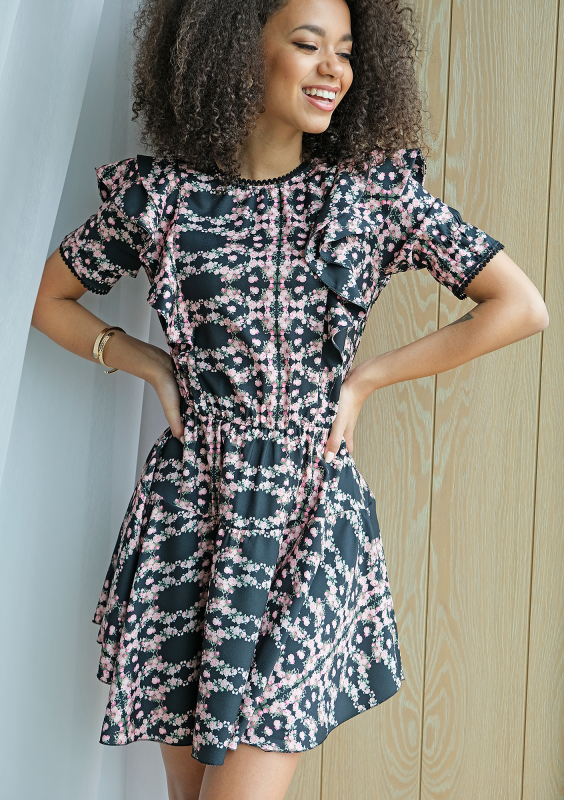 BLACK FLOWERS PRINT DRESS WITH RUFFLES