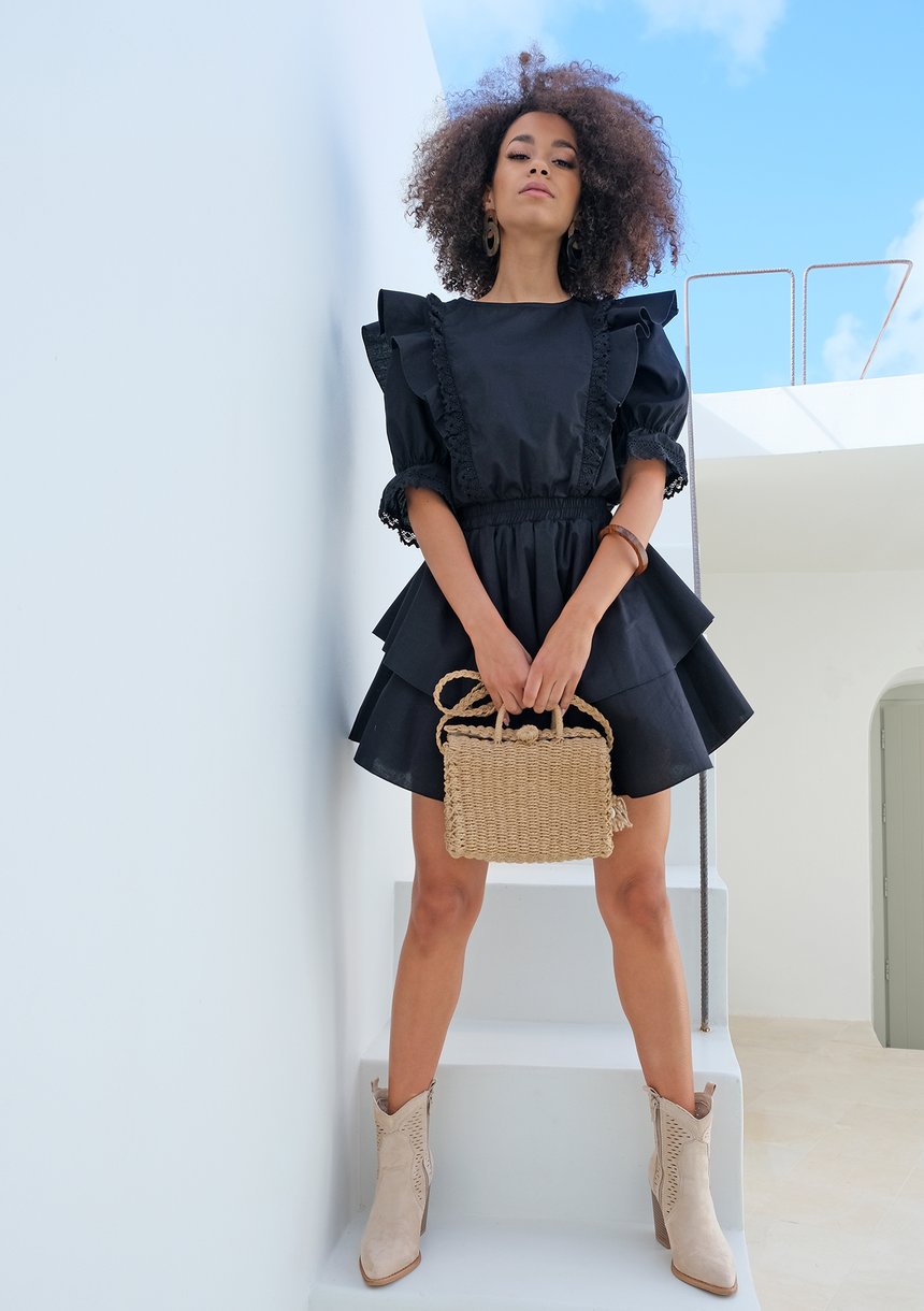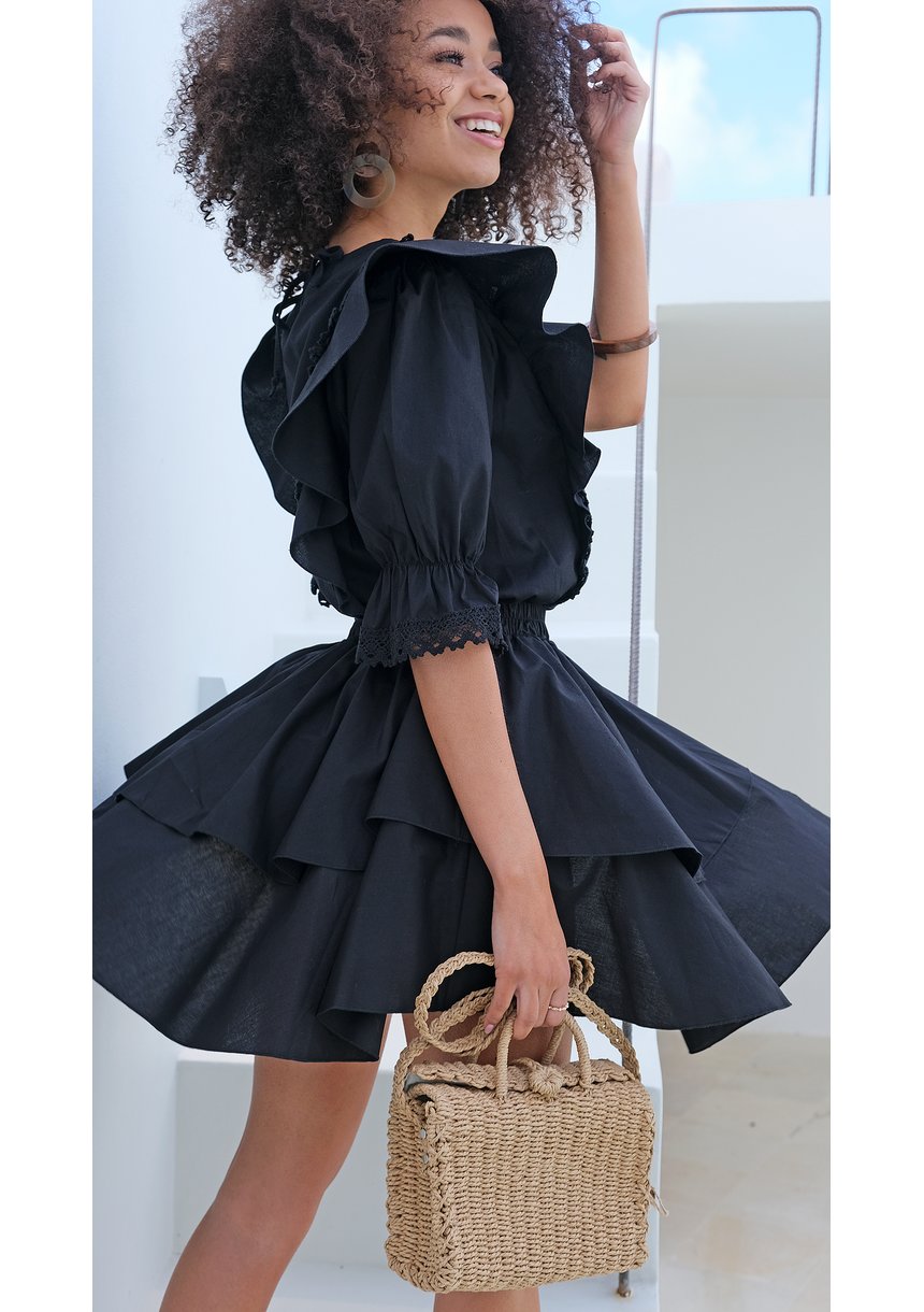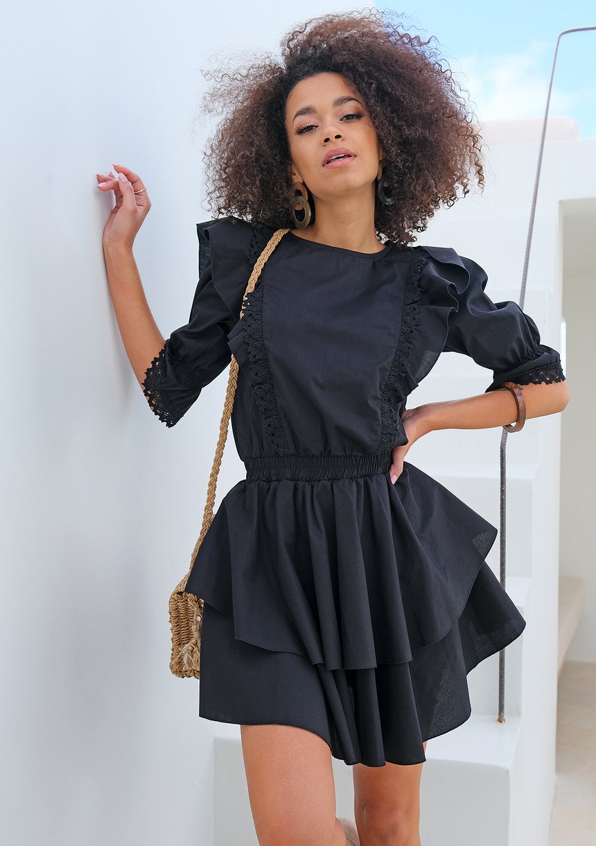 BLACK POPLIN DRESS WITH FRILLS AND LACE