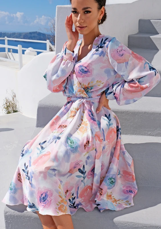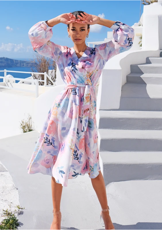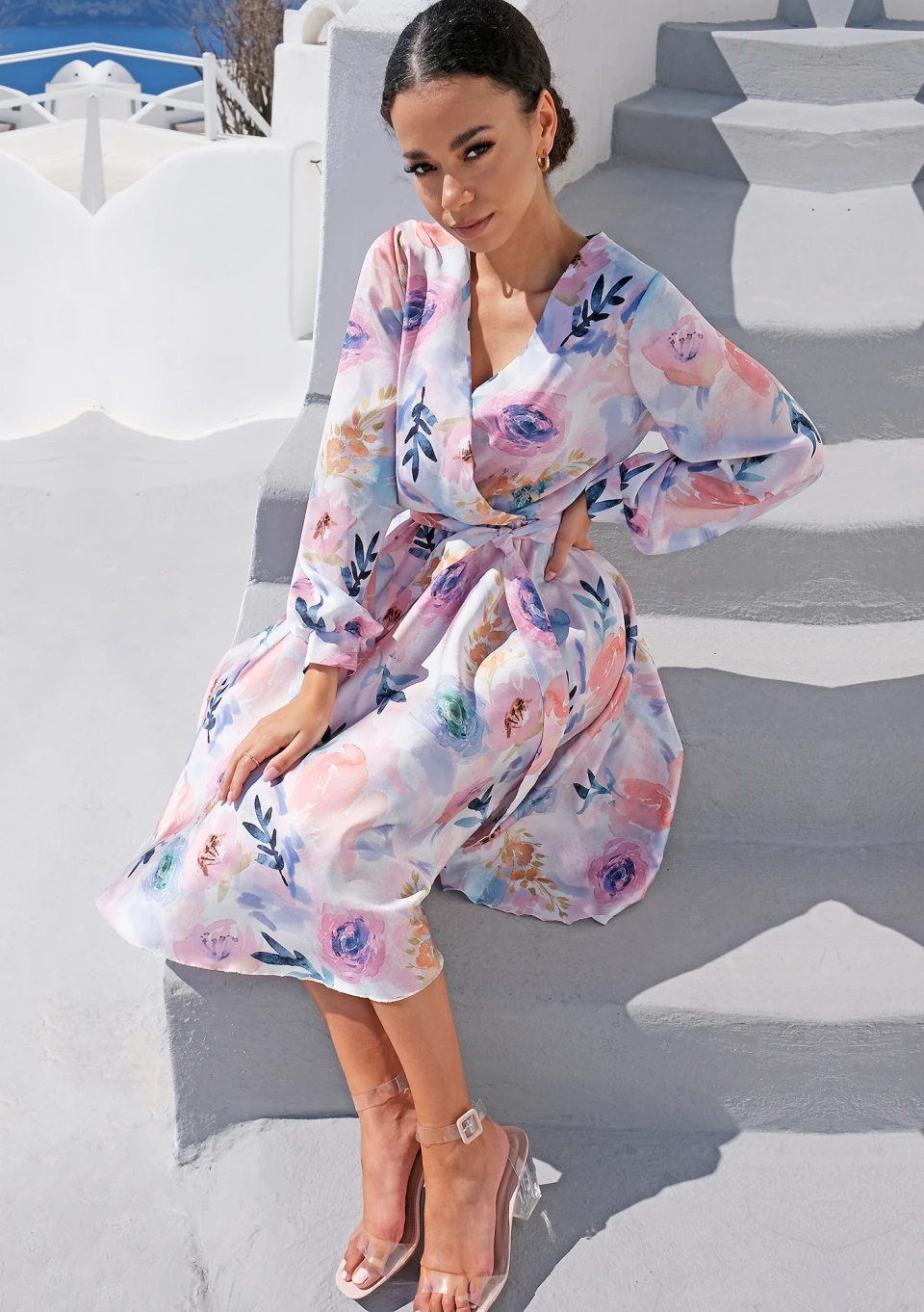 Ludmila - ecru midi wrap dress in pastel flowers print