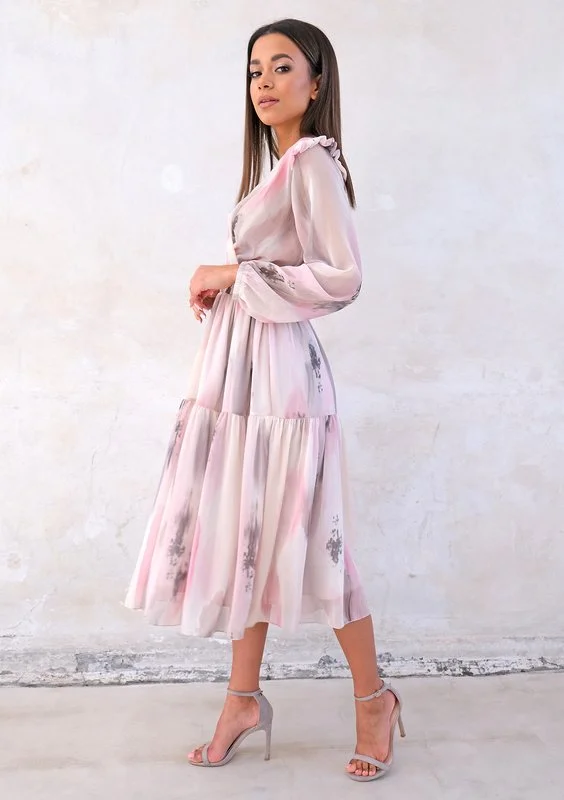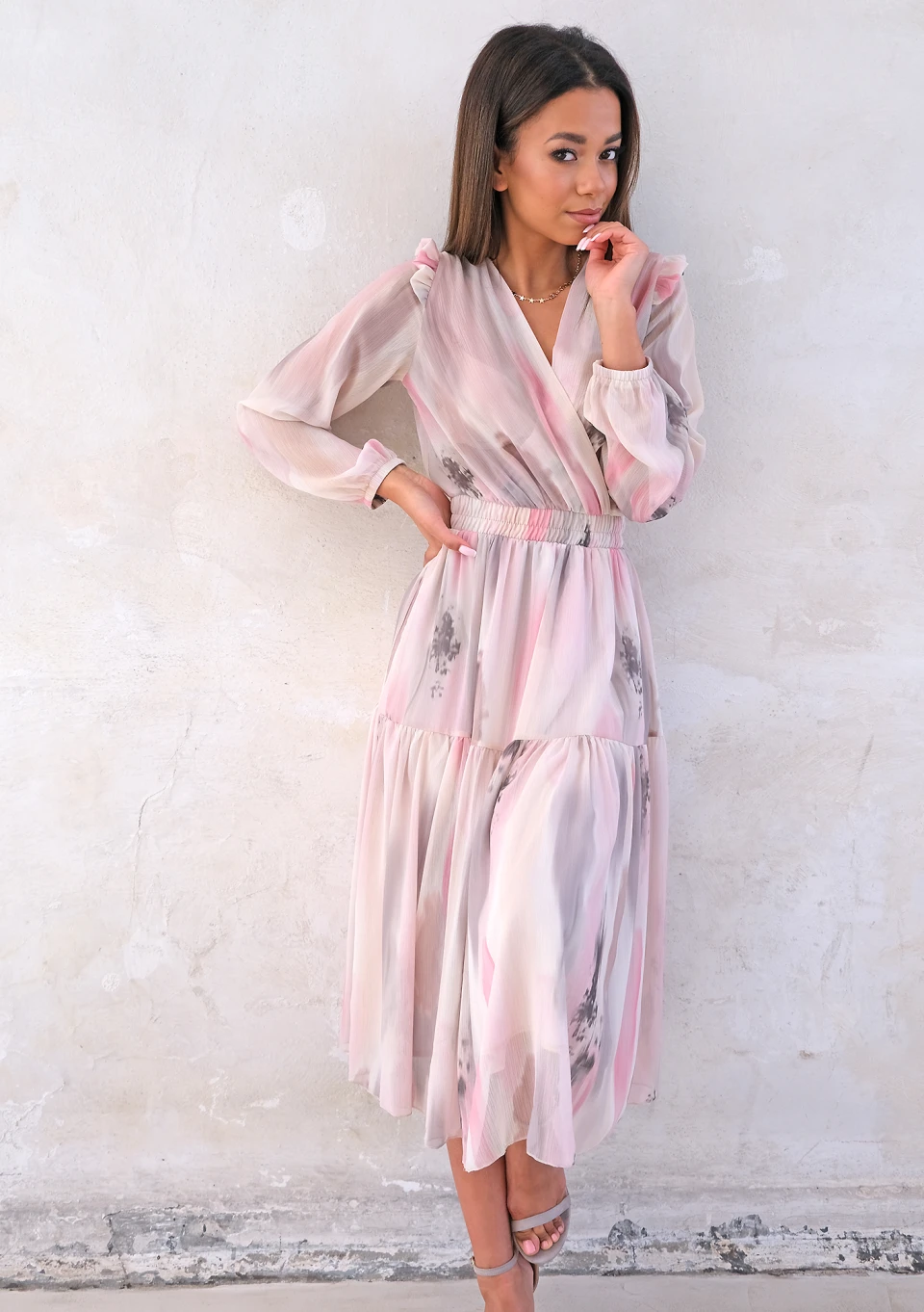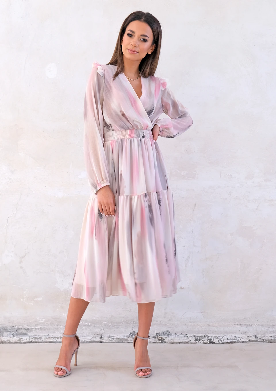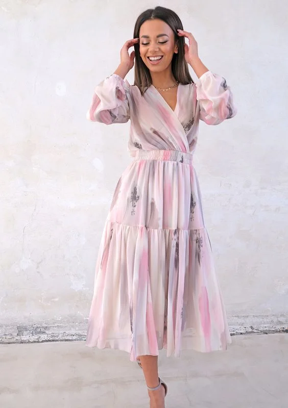 On sale! -20% Dorotea - midi chiffon dress with pink and grey print zł259.99 zł207.99 Lowest price from the last 30 days zł259.99