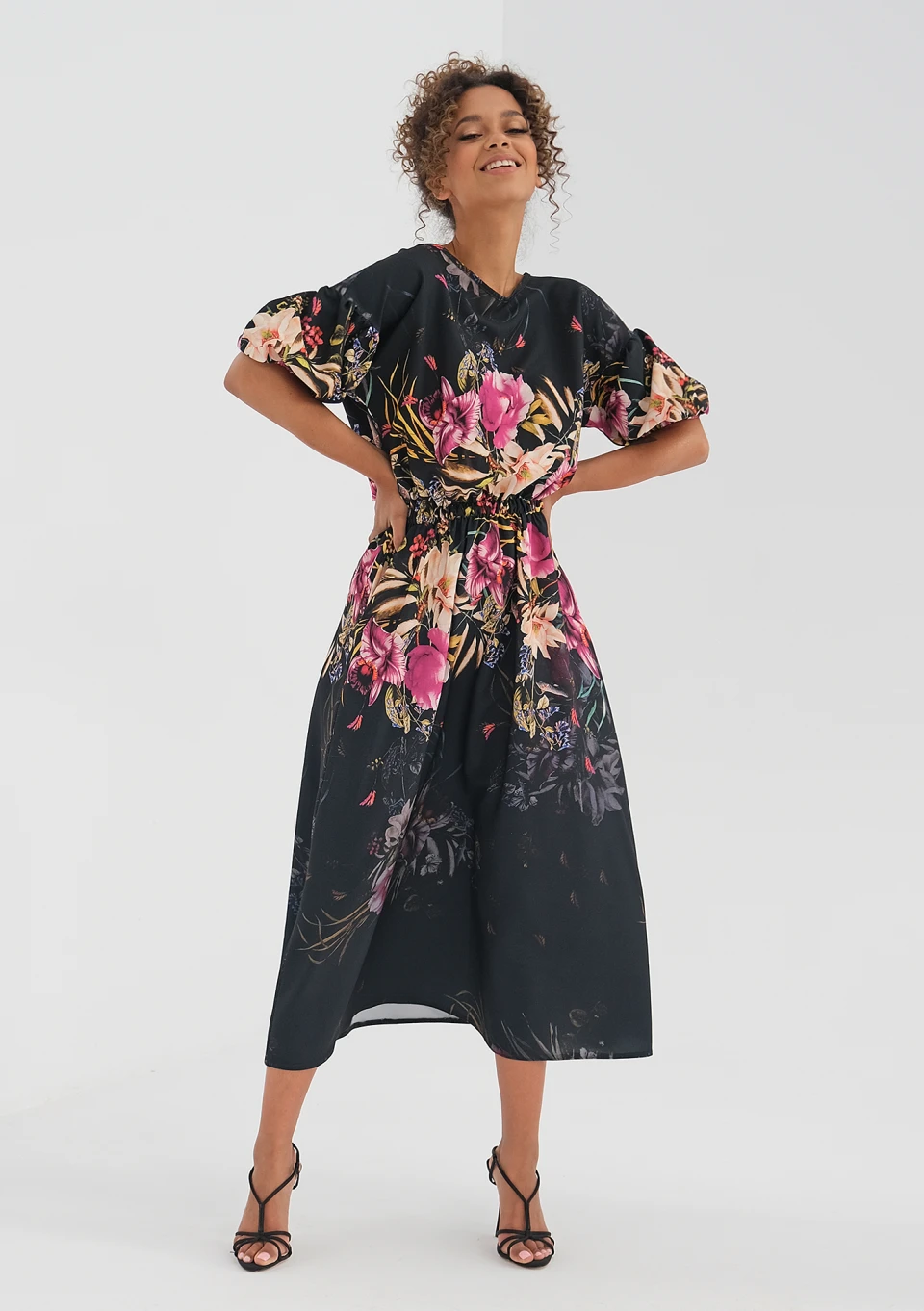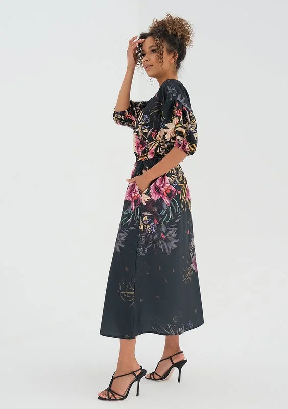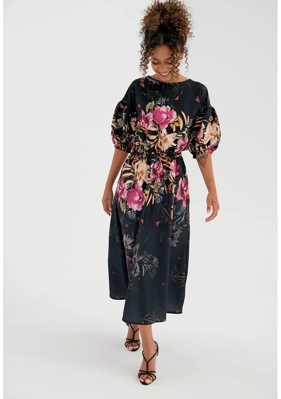 midi black dress with a peony flower print