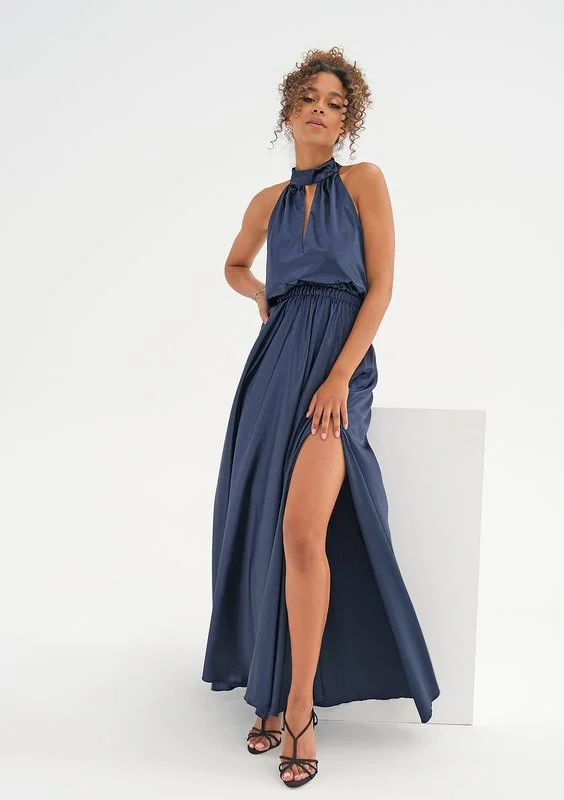 Karine - maxi green satin dress with a halter neckline