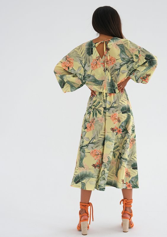 Vera - Leaves printed yellow midi dress