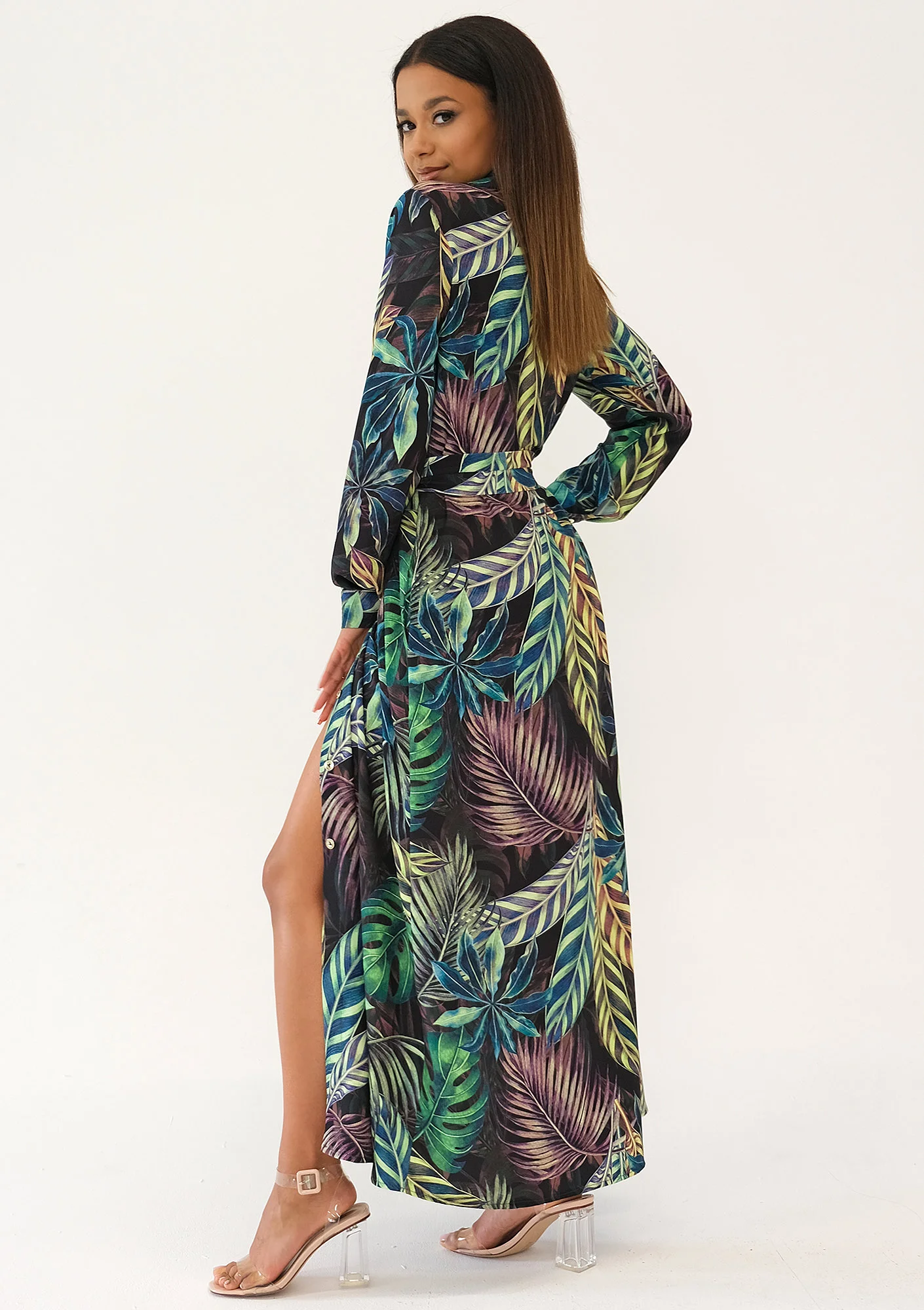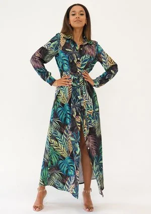 Sofia - Leaves printed maxi shirt dress