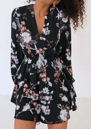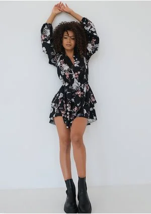 Mia - Black floral printed mini dress with frills