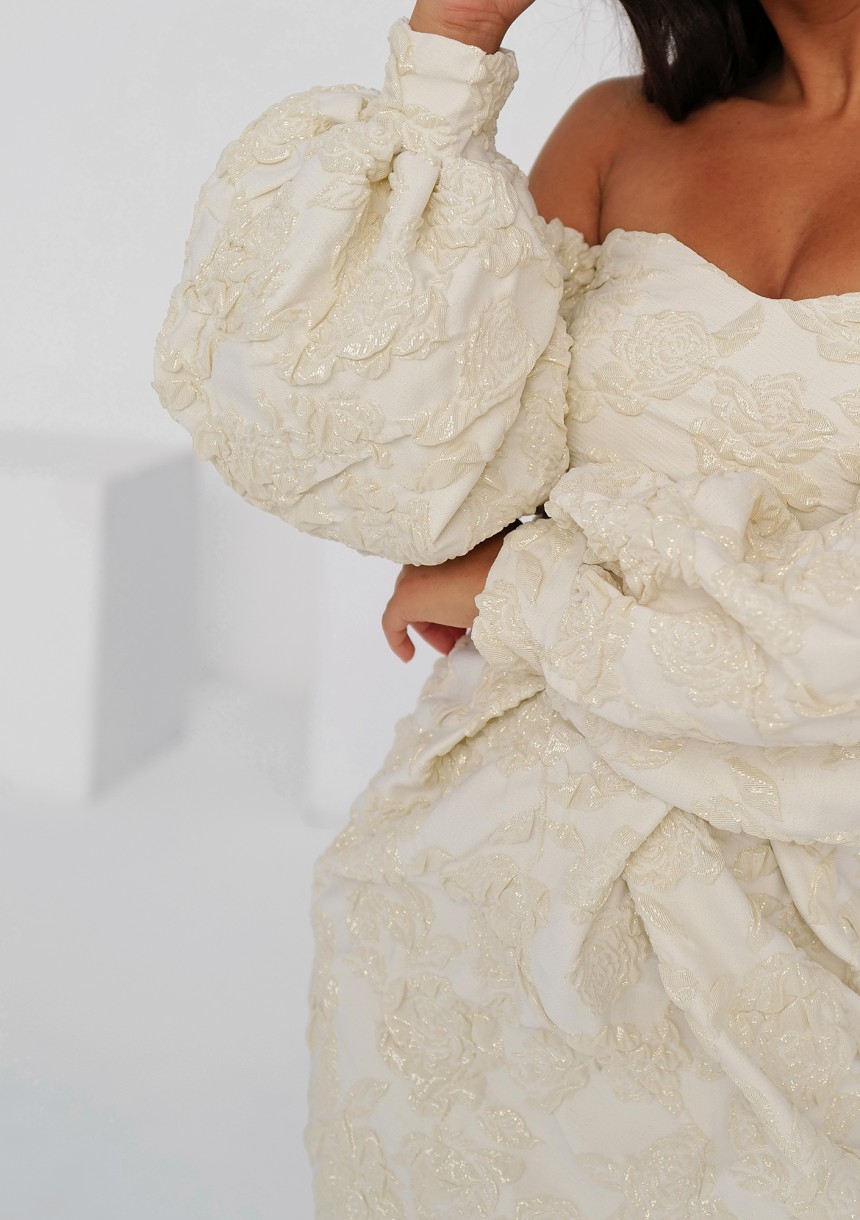 Sonia - Off shoulders ecru jacquard mini dress