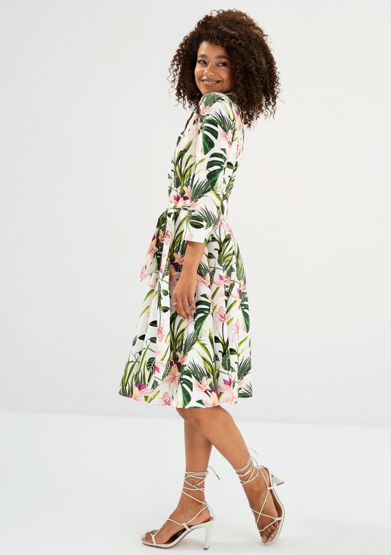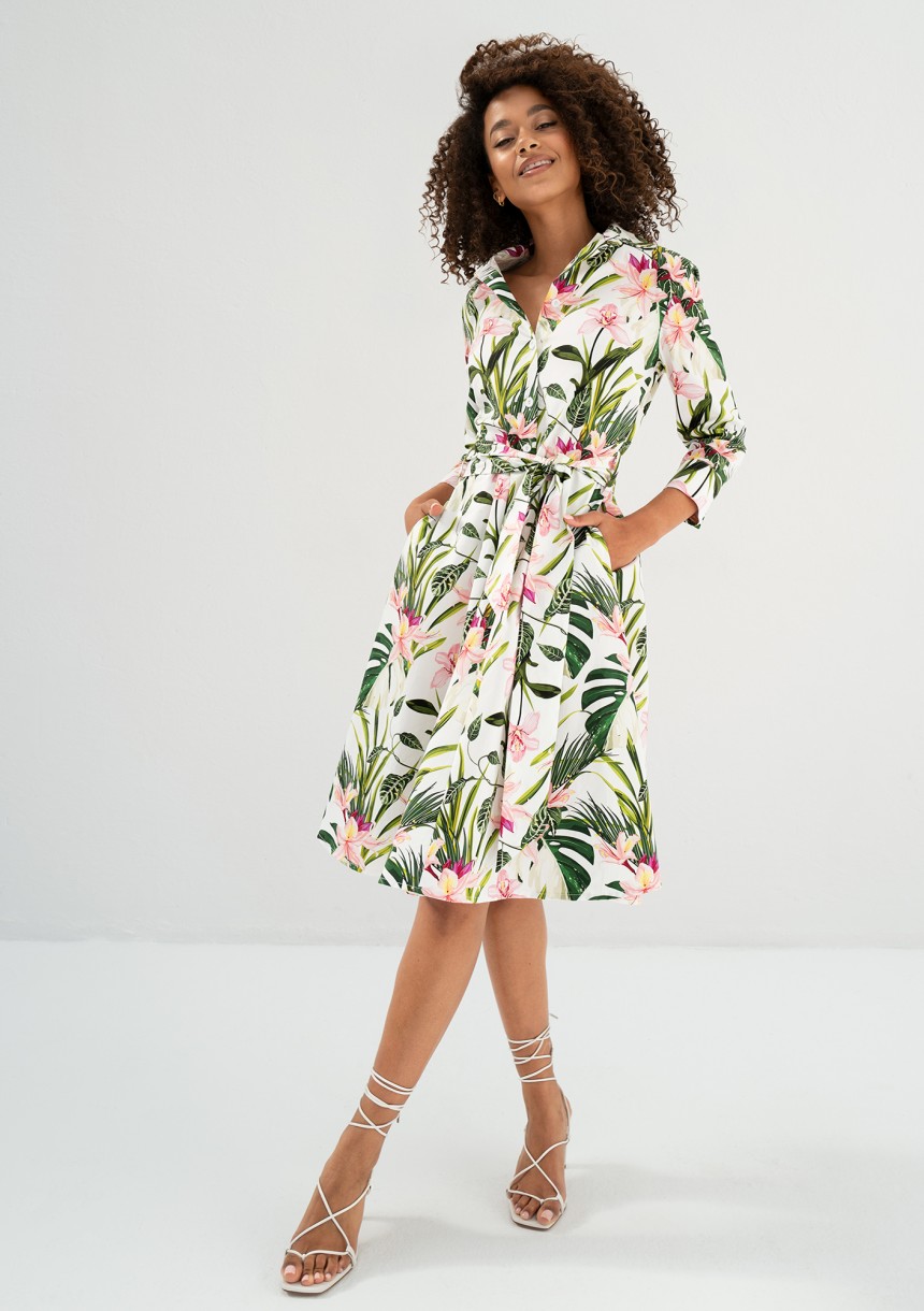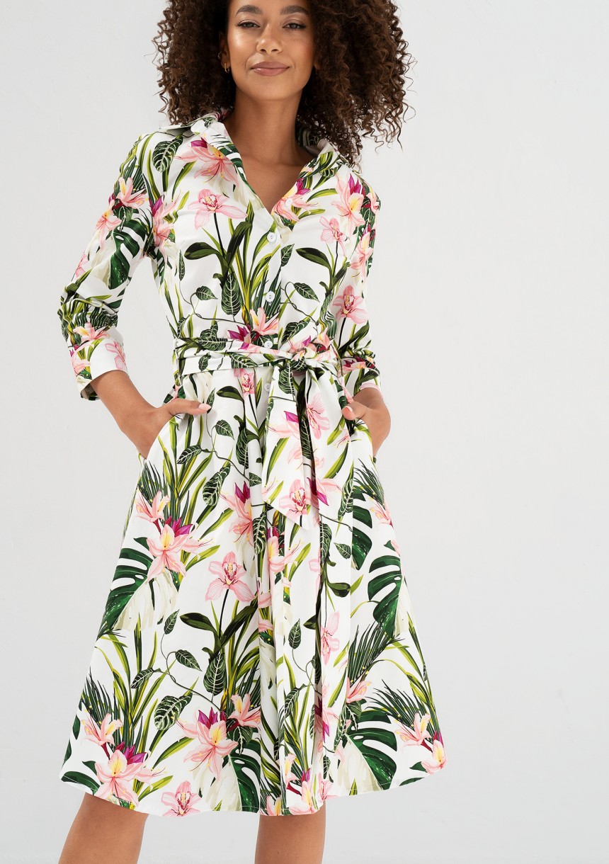 Sally - Ecru leafy patterned cotton midi shirt dress
