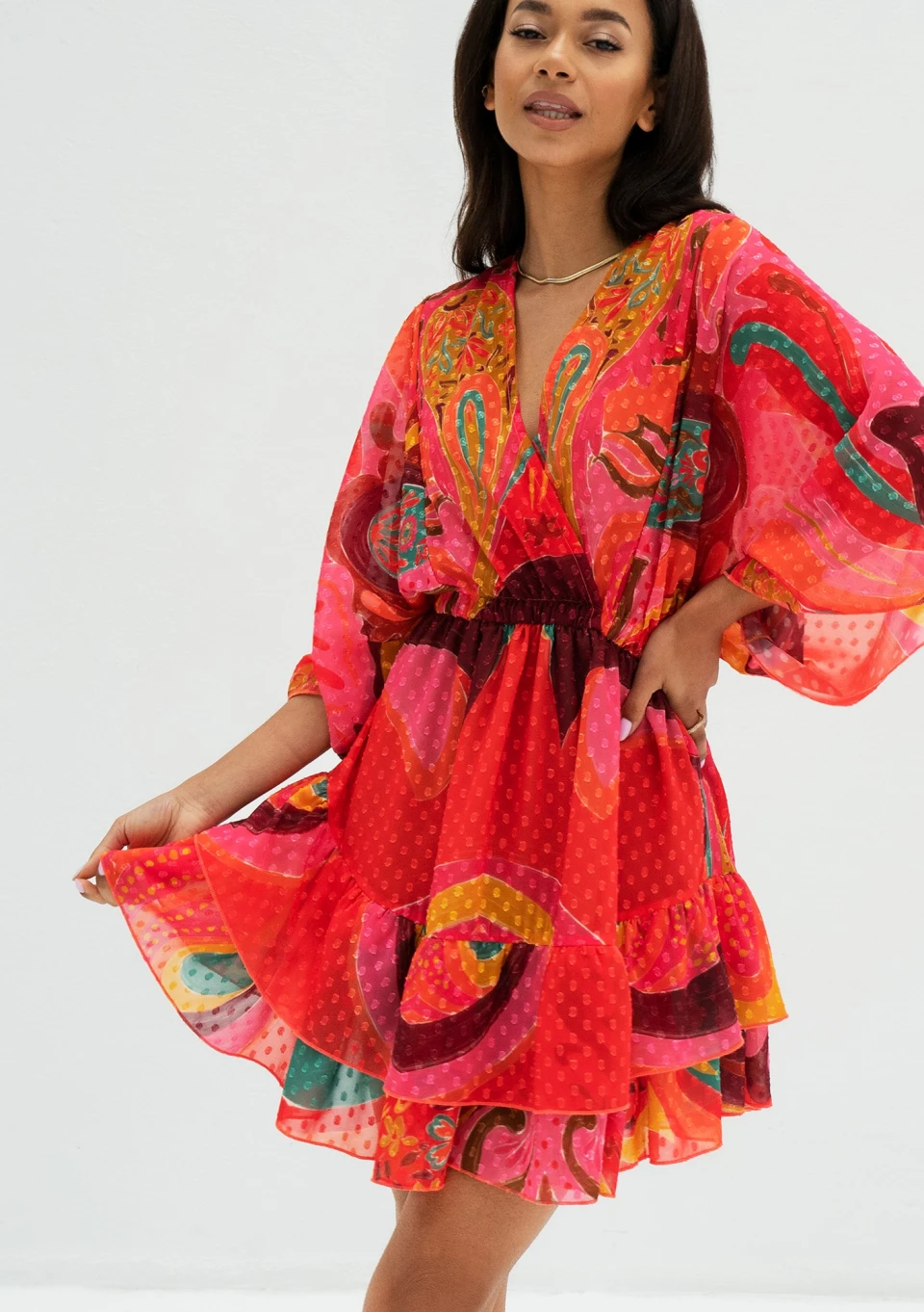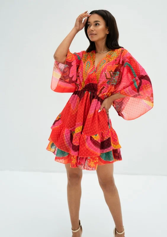 Senaya - Red boho printed chiffon mini dress