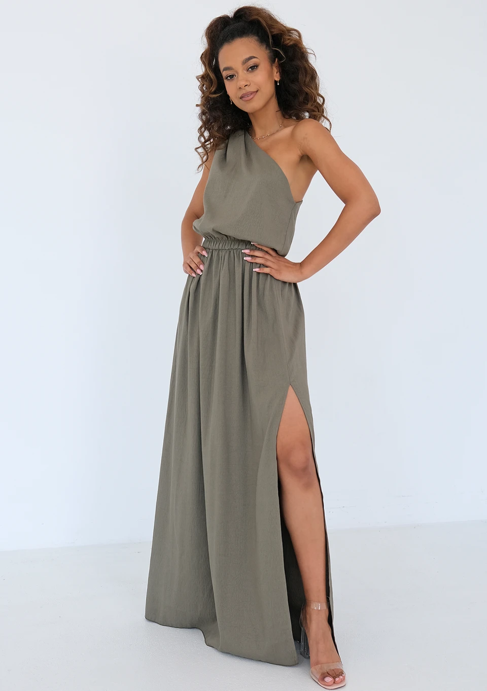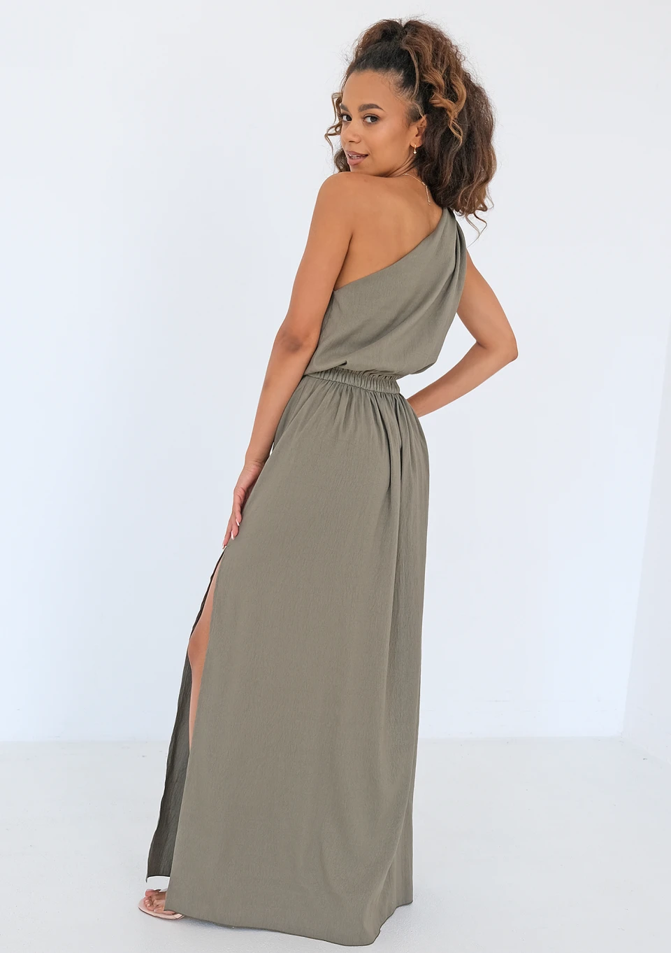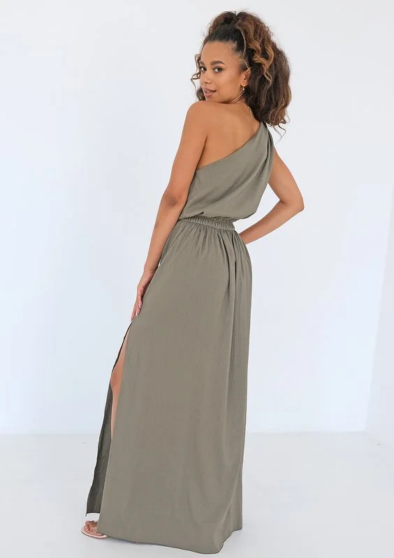 Athina - Asymmetric olive green maxi dress
