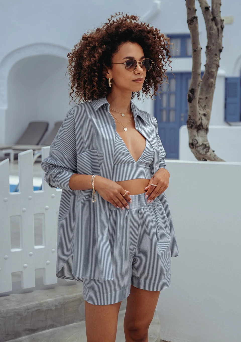Jacque - Navy blue striped cotton crop shirt