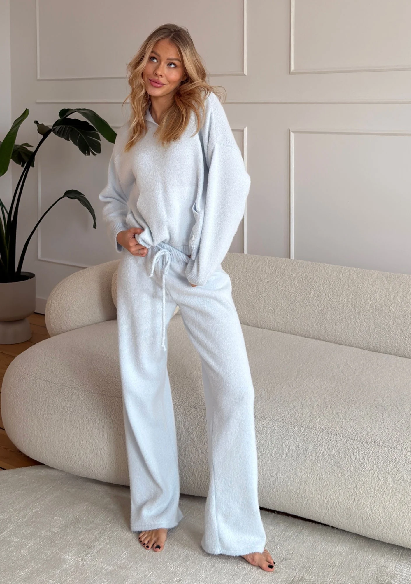 Nemi Soft - Light blue knitted jumper with a pocket and a hood