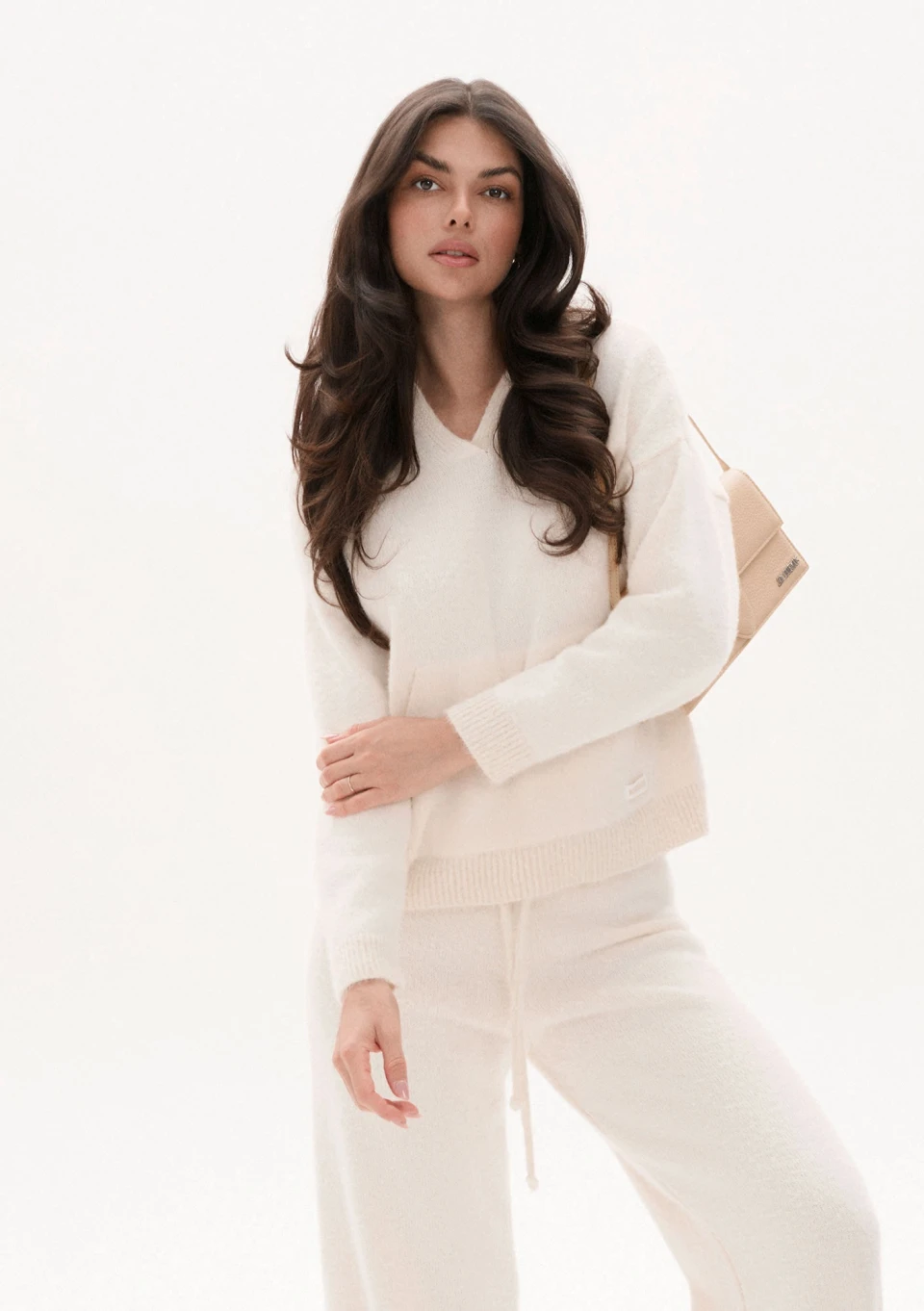 Nemi Soft - Beige knitted jumper with a pocket and a hood