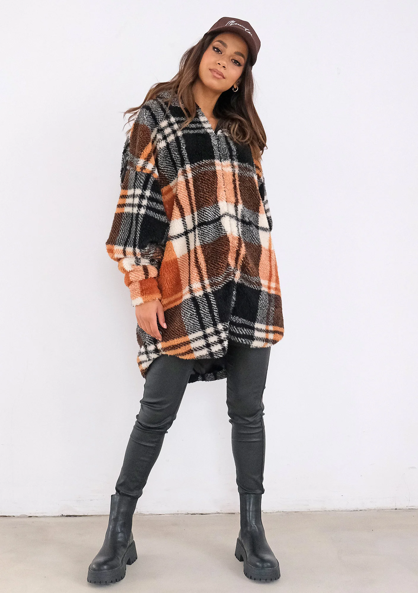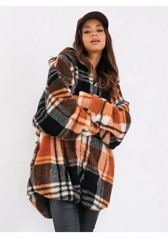 Merino - oversize checked brown boucle hoodie