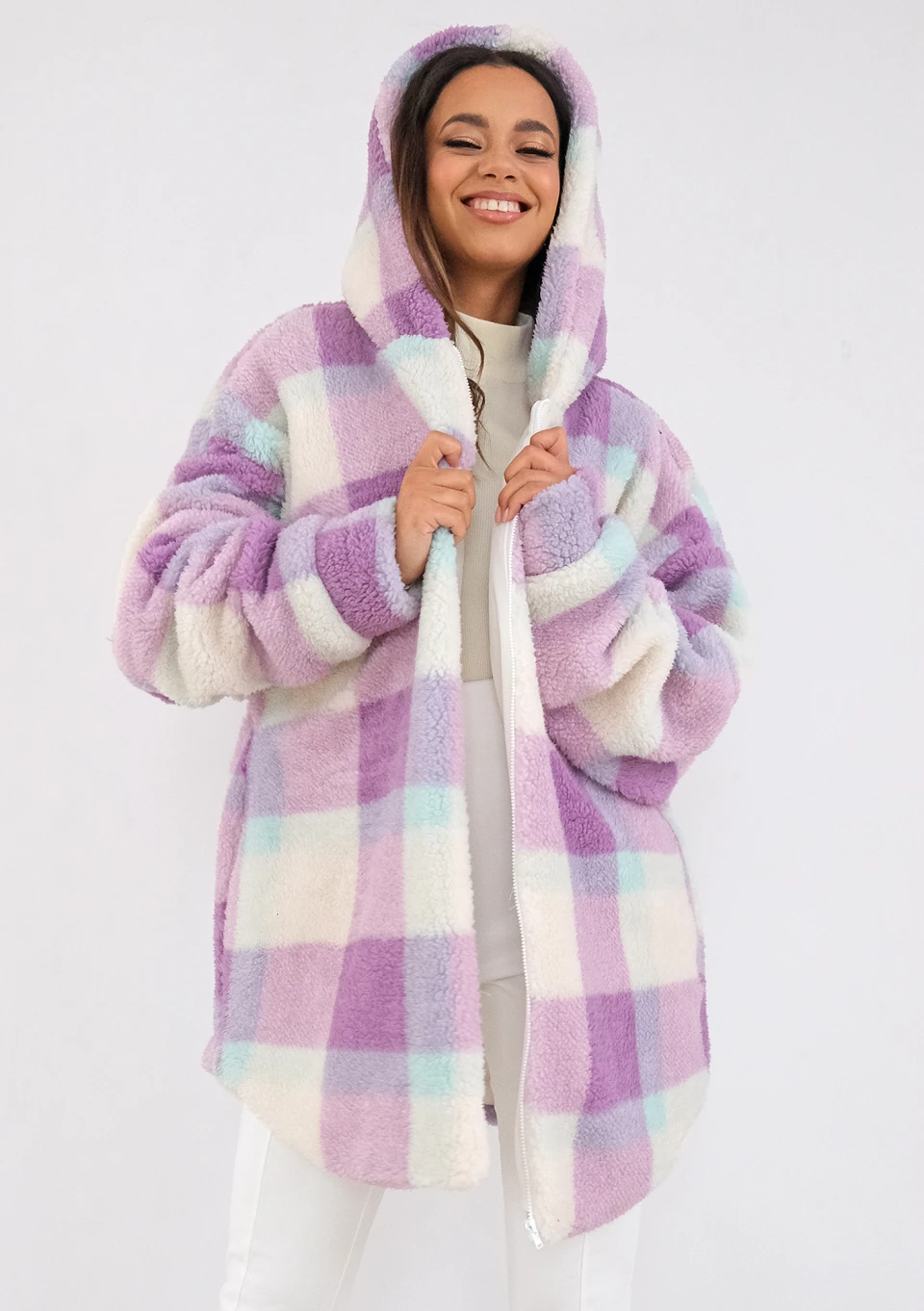 Merino - oversize checked lila boucle hoodie