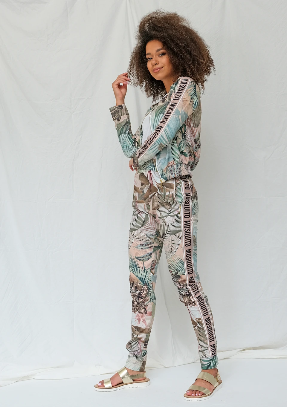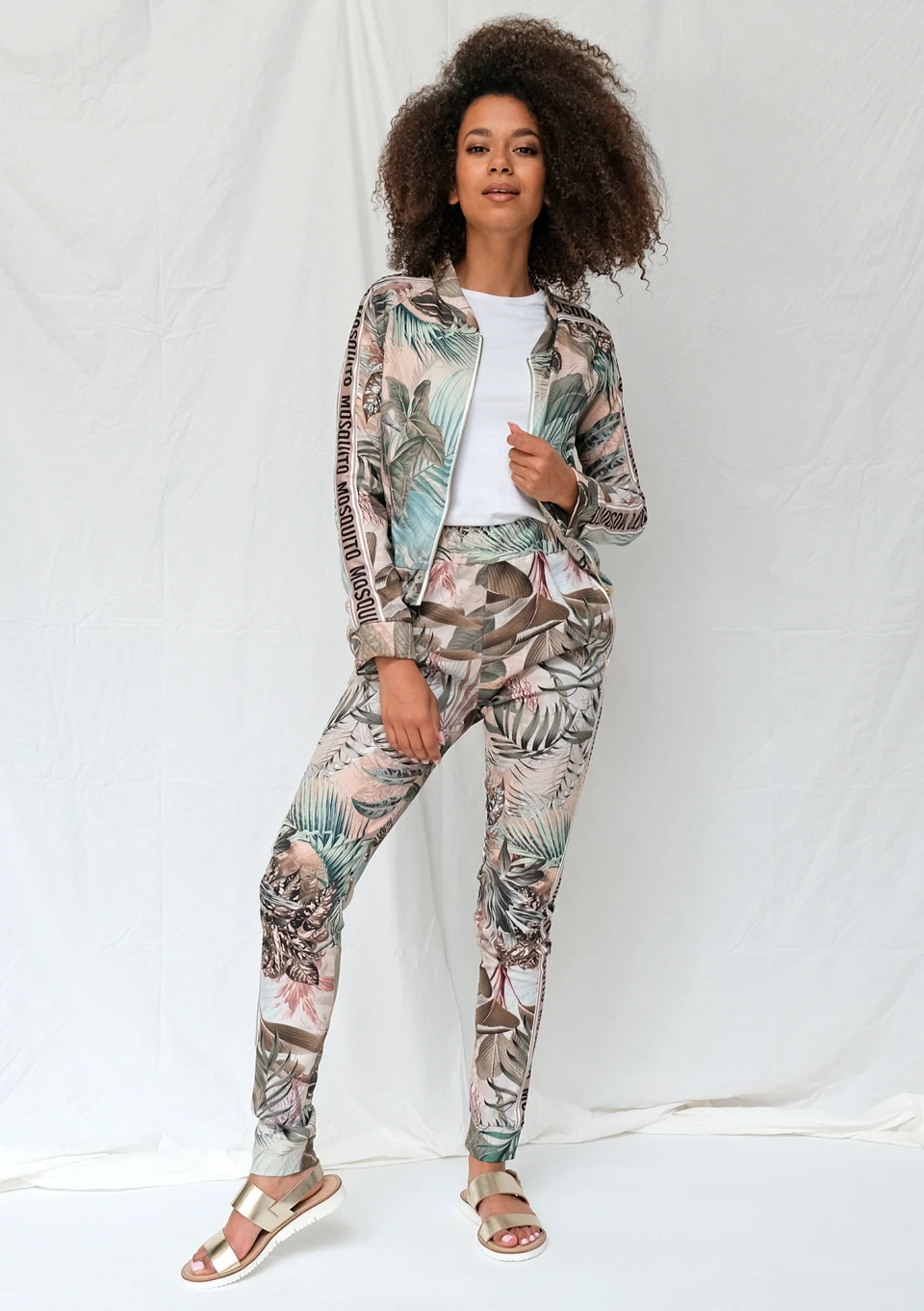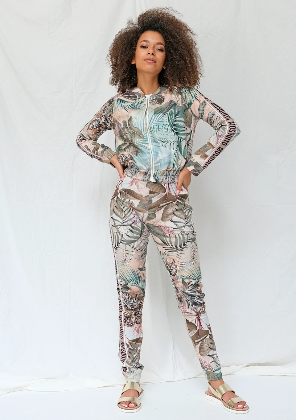 Exotic garden print pants with logo stripe