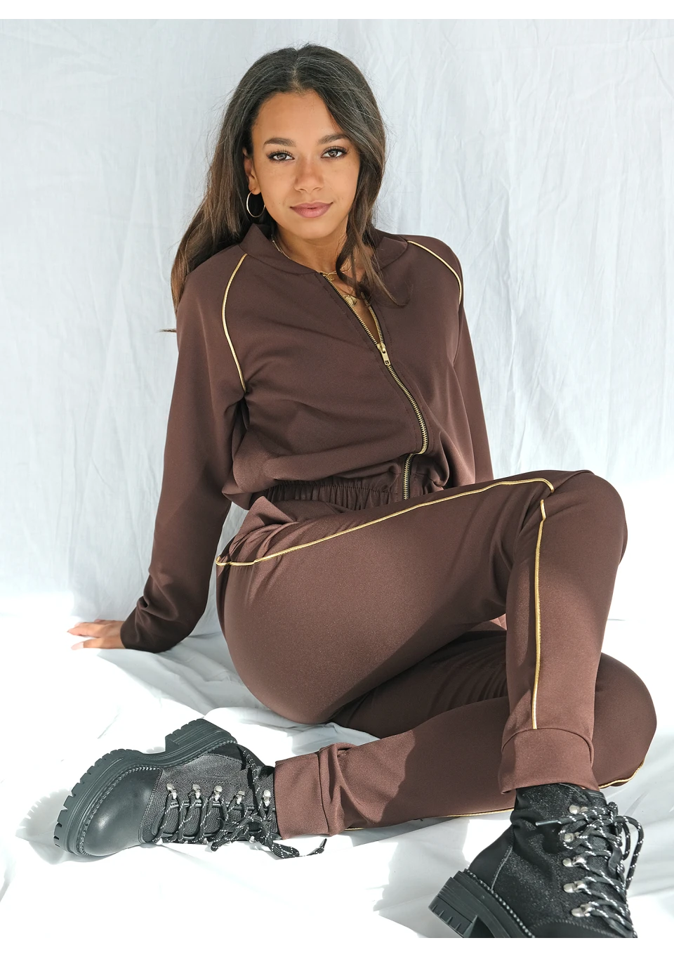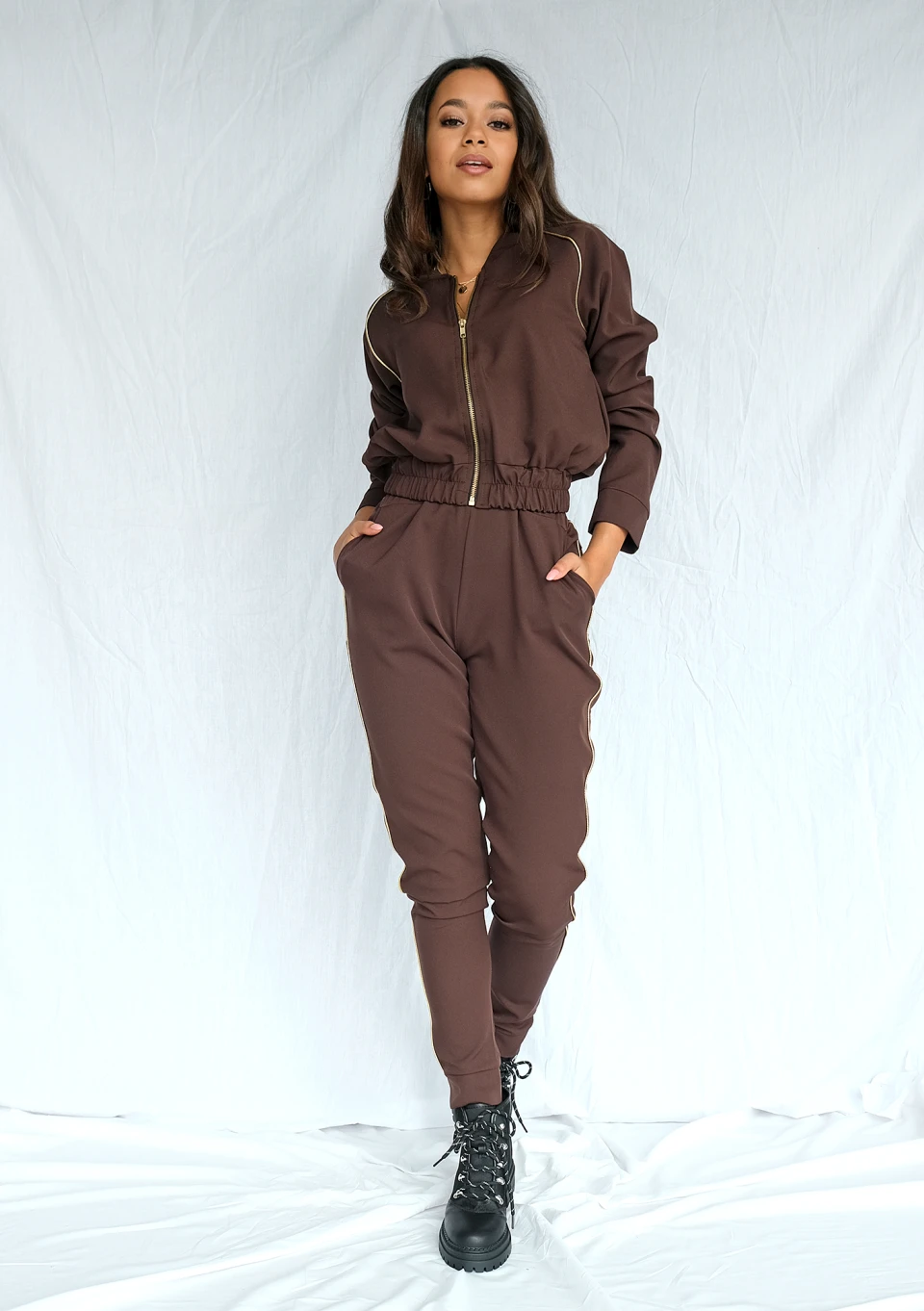 Chocolate brown trousers with gold stripe