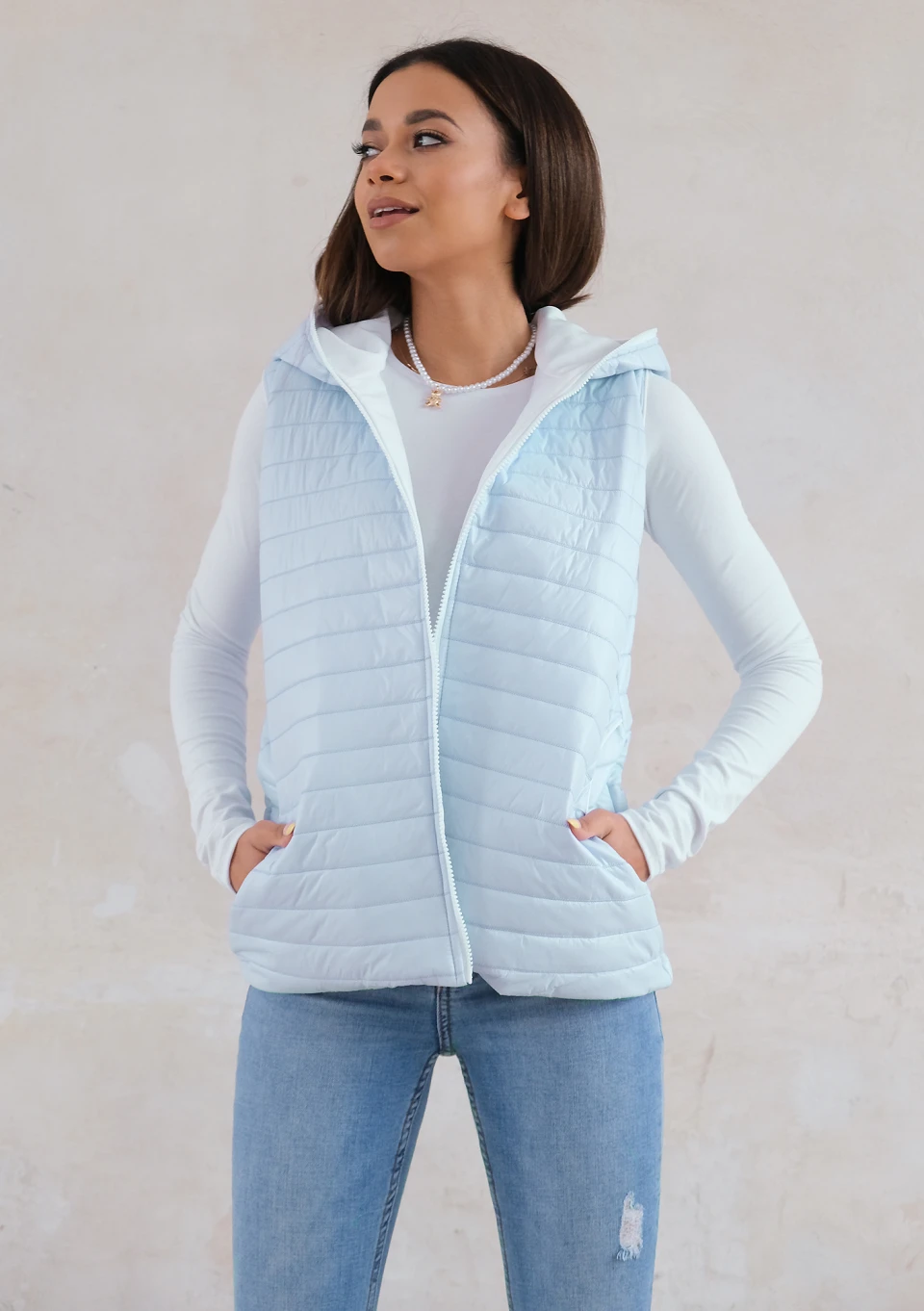 Quilted sleeveless light blue jacket