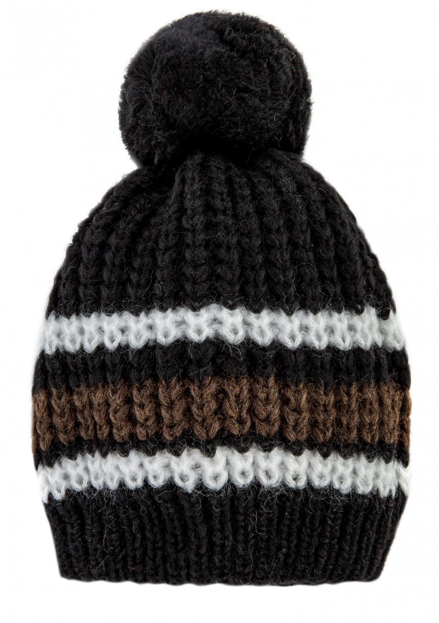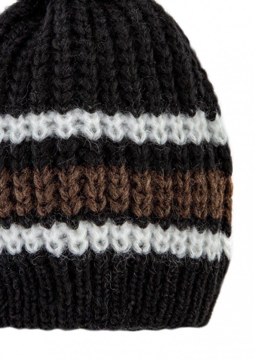 Czarna czapka zimowa z pomponem dla miłośniczek sportowego designu. Dodatek został wykonany w paski, z miękkiej i bardzo ciepłej włóczki z dodatkiem wełny.