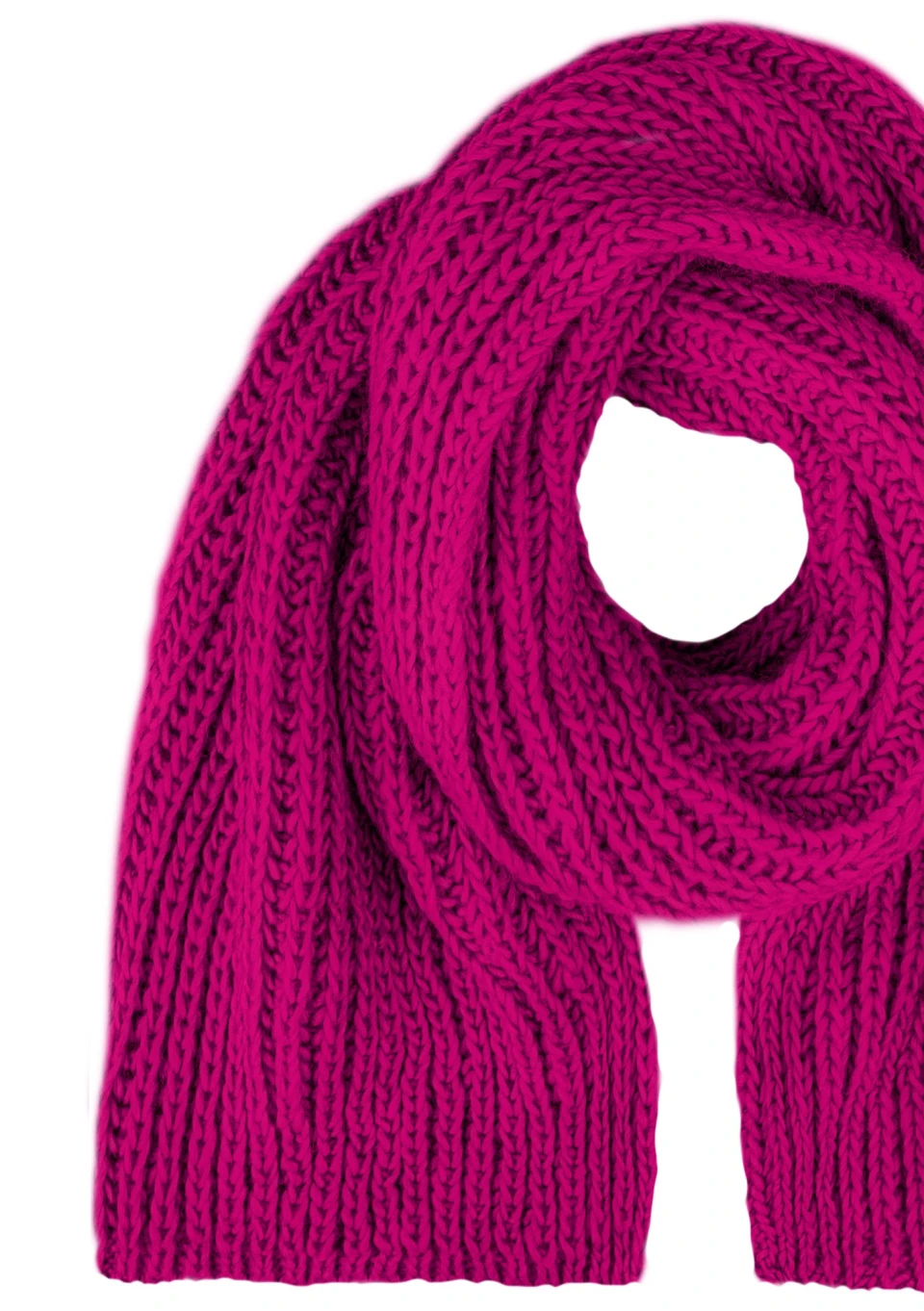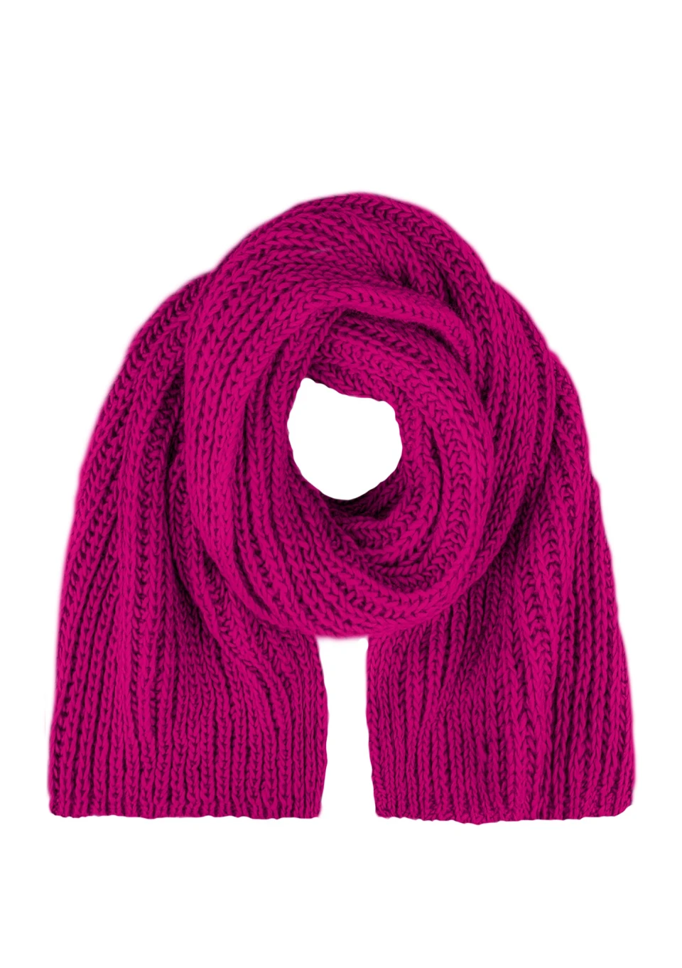 Ciepły, zimowy szalik damski z miękkiej dzianiny w kolorze fuksji. Produkt zawiera wełnę, dlatego nadaje się idealnie na bardzo chłodne dni.