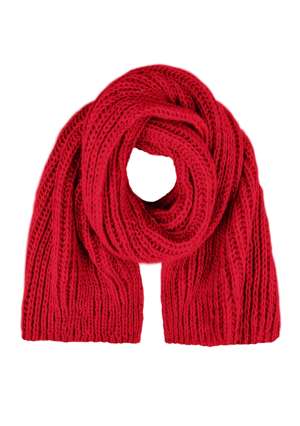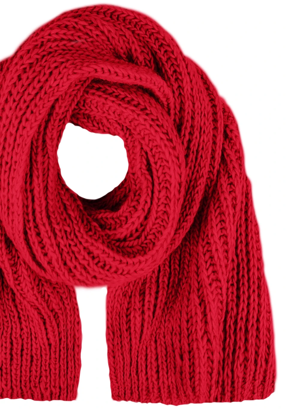 Grubay i ciepły szalik damski w czerwonym kolorze. Starannie wykonany w naszej pracowni z miękkiej dzianiny z wełną. Model o optymalnej, wygodnej długości.