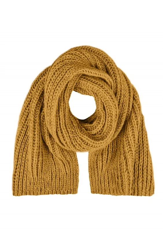 Zimowy szalik damski, wykonany z miękkiej i ciepłej dzianiny z dodatkiem wełny. Model w musztardowym kolorze.