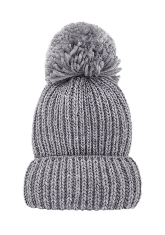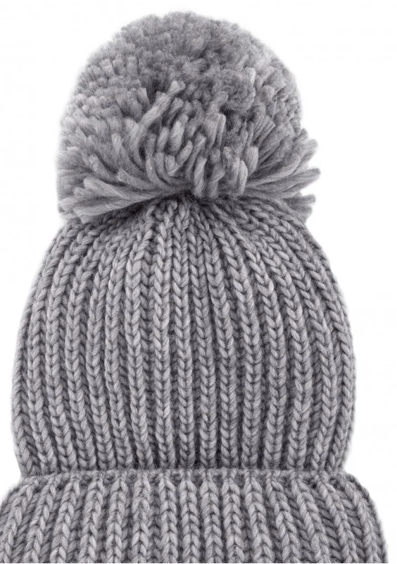 Gruba czapka damska z pomponem w szarym kolorze. Wykonana z miękkiej włóczki z wełną, dlatego zapewni maksimum wygody i ciepła. Idealna na najchłodniejsze dni.