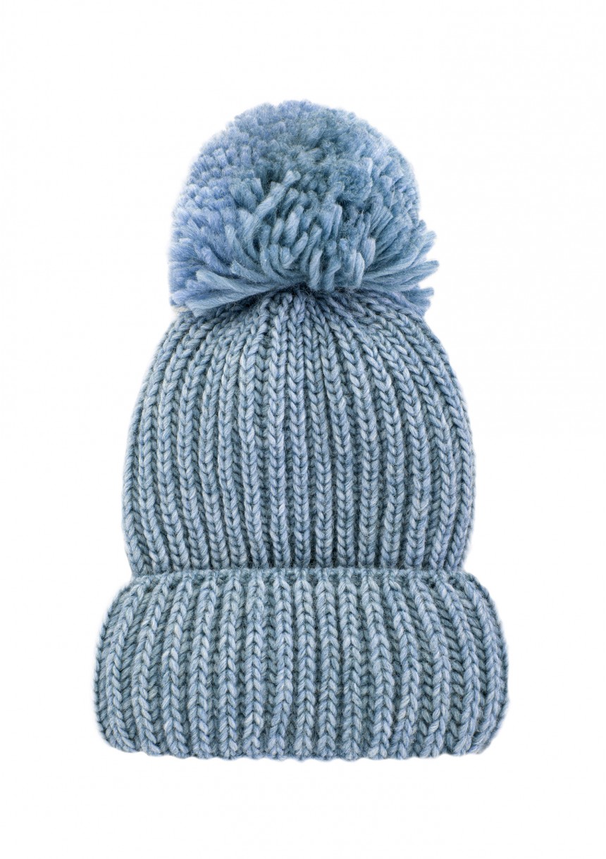 Czapka zimowa w jeansowym odcieniu z uroczym pomponem. Gruba i przyjemnie miękka. Zawiera wełnę, dlatego świetnie sprawdzi się w najchłodniejsze dni.