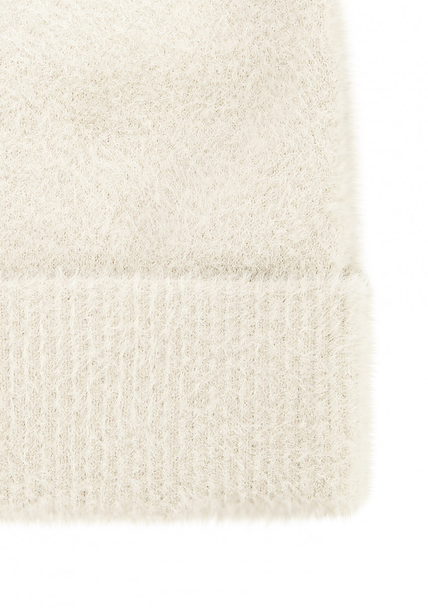 Elegancka czapka damska z dzianiny o miękkim włosiu faktury w kolorze bieli ecru. Klasyczny model zadba o Twoje ciepło i szykowny styl.