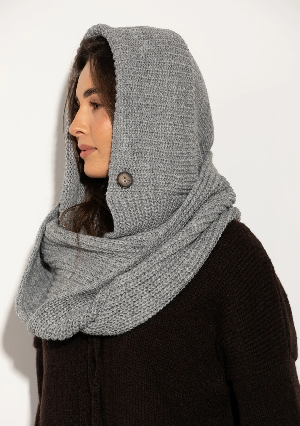 Dzianinowy kaptur to modne i bardzo praktyczne rozwiązanie na zimowe chłody. Oto model zapinany na guzik, wykonany w szarym kolorze.