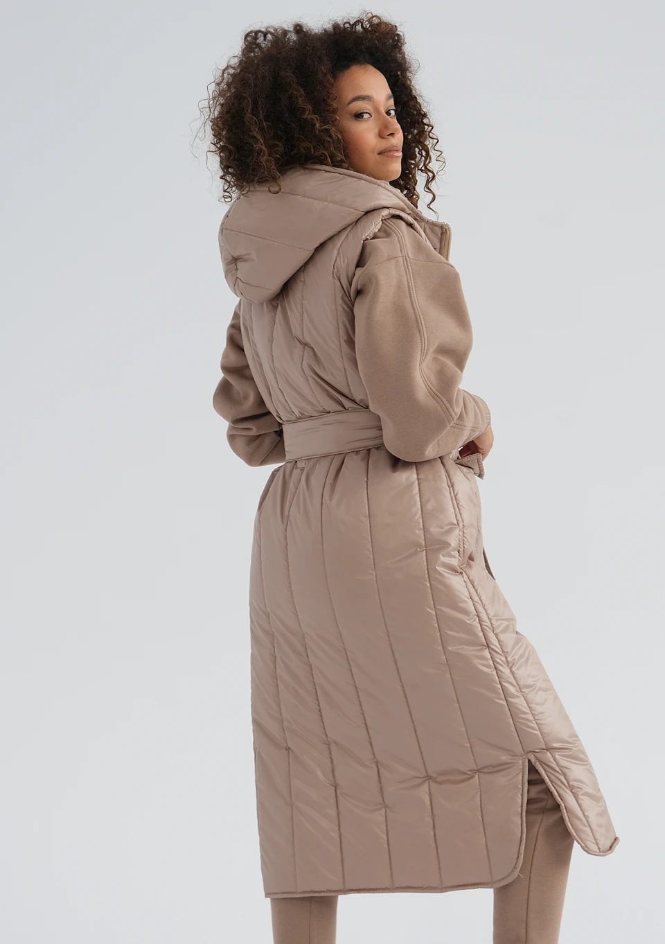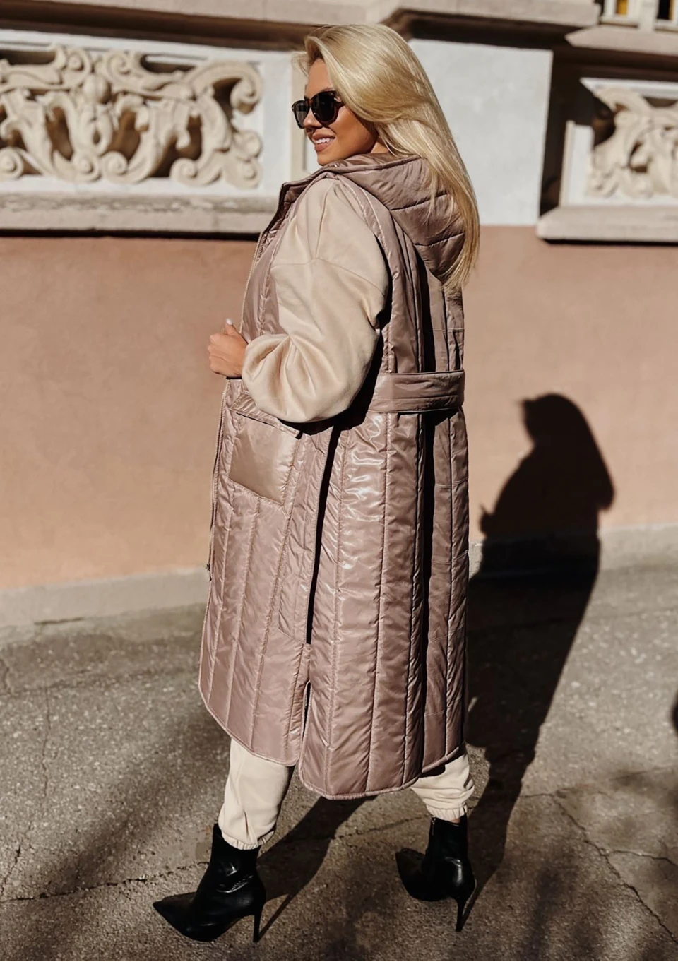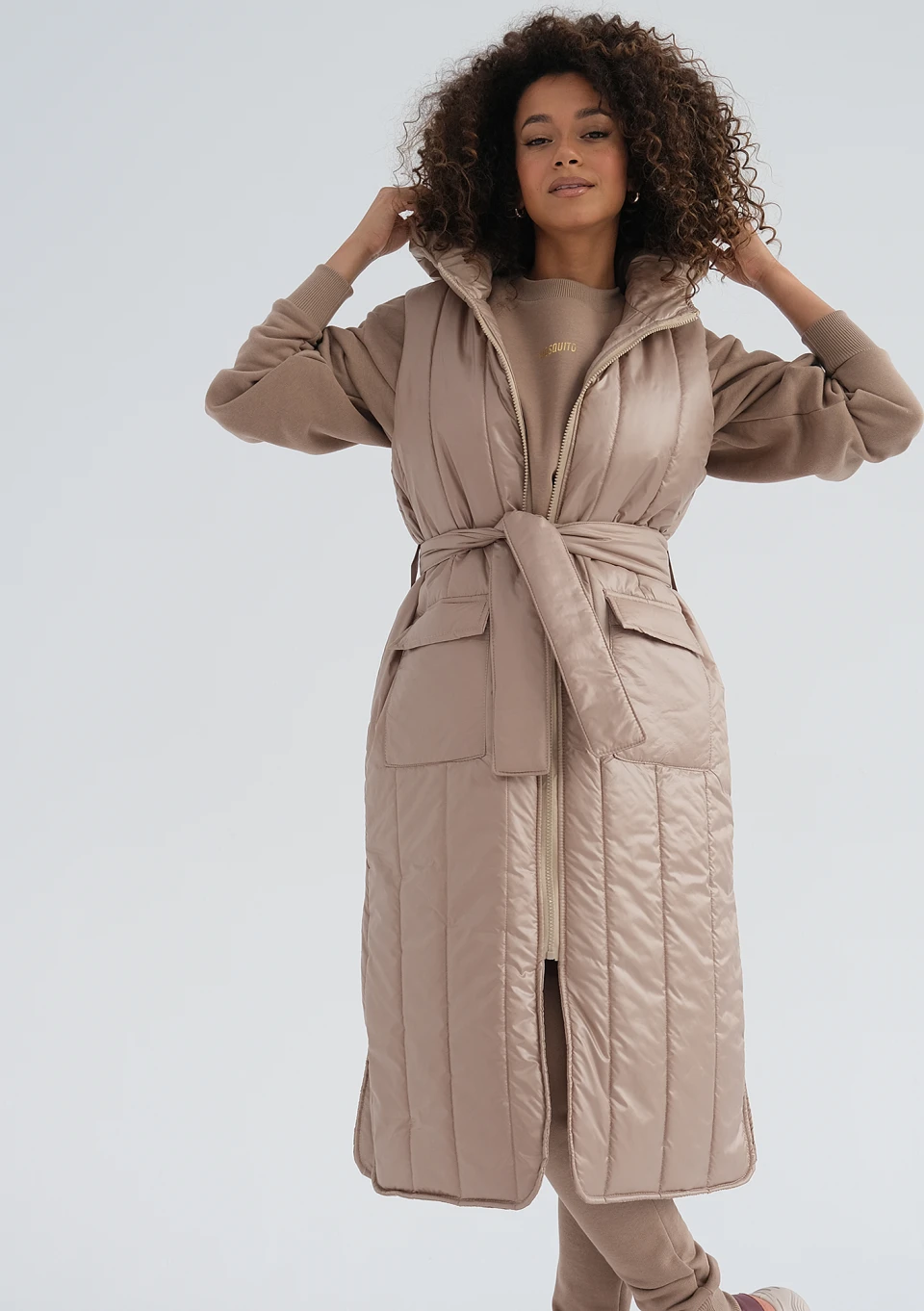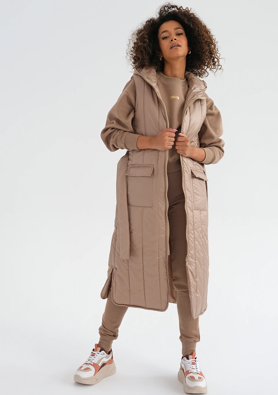 Długi bezrękawnik damski w eleganckim beżu to najmodniejszy fason na jesienne chłody. Funkcjonalna długość midi, kaptur oraz nieprzemakalny i lekki materiał nie pozwolą Ci zmarznąć.