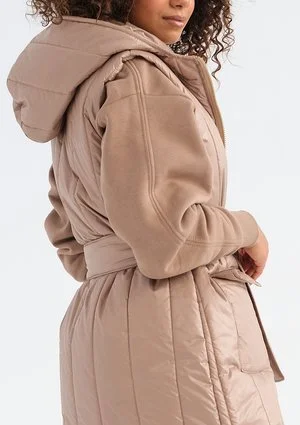 Bezrękawnik został uszyty z wodoodpornej tkaniny z miękkim wypełnieniem. Od wewnętrznej strony jest śliski, dlatego nie będzie uszkadzał ubrań założonych pod spód. W modelu znajdują się dwie pojemne kieszenie, a także kaptur. Do produktu dołączony jest pasek, aby luźny krój podkreślał talię. Fason jest zapinany solidnym zamkiem błyskawicznym w pasującym kolorystycznie do całości beżu. Maren to długi bezrękawnik, który sprawdzi się w okresach przejściowych. Model jest dostępny także w granacie, czerni i bordo.