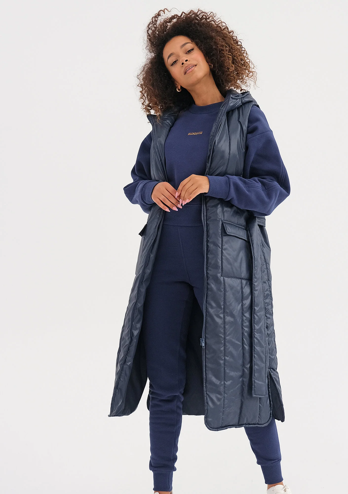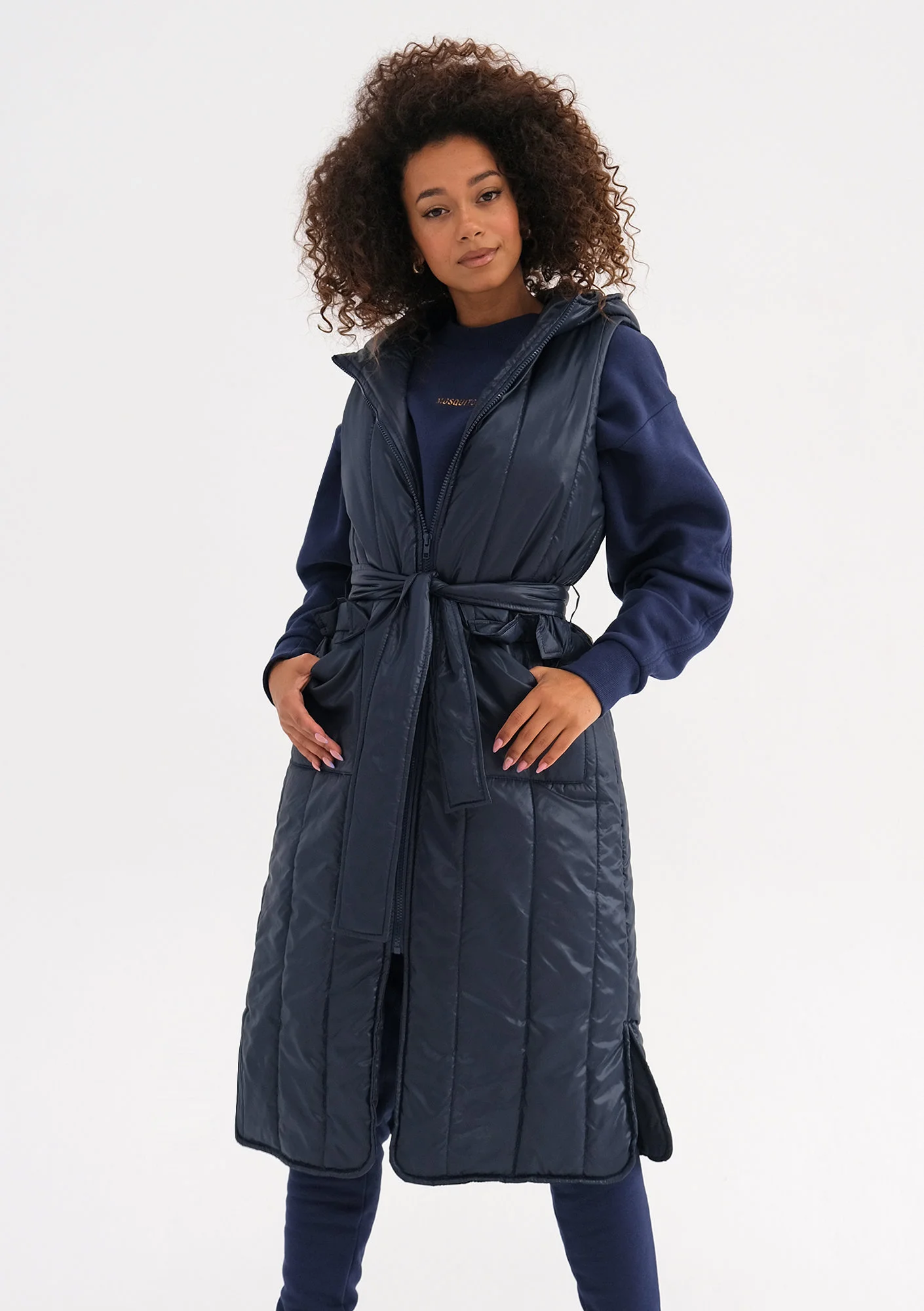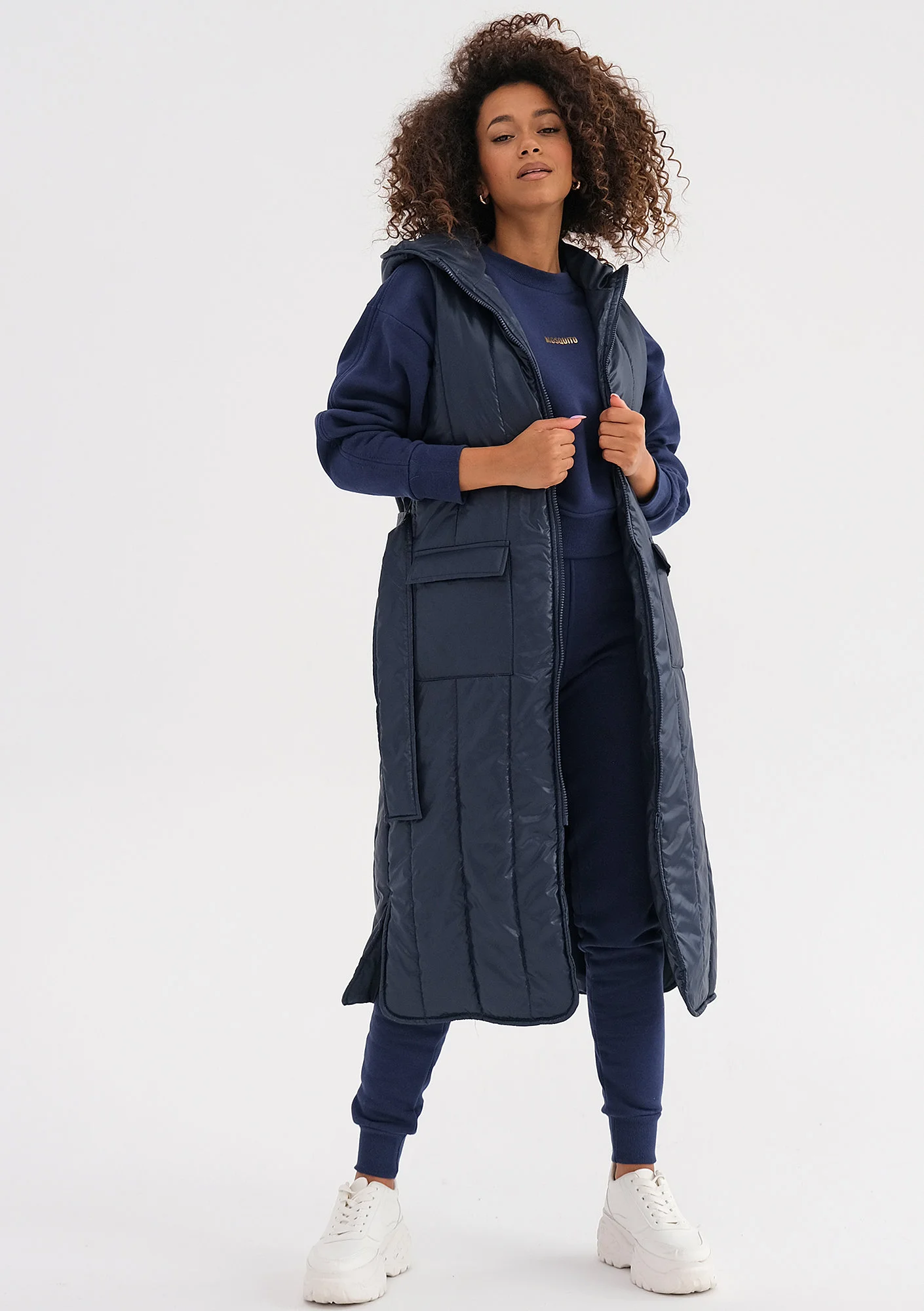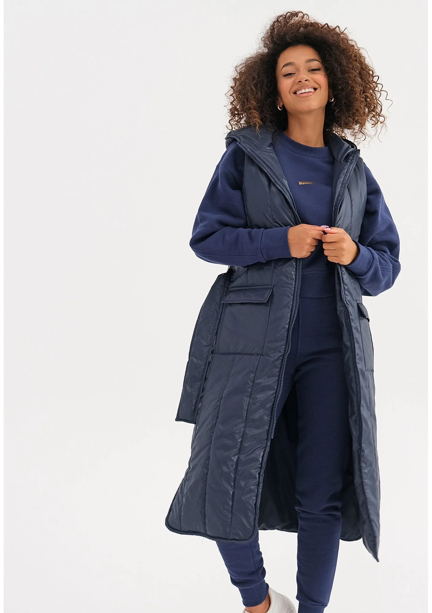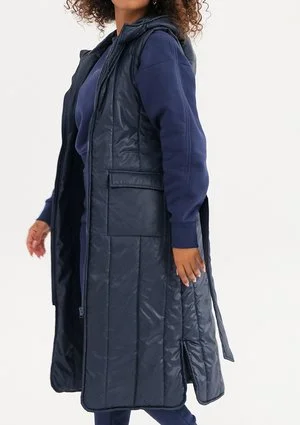 Ten długi, lekki płaszcz bez rękawów zapewni Ci ciepło w najważniejszych partiach sylwetki. Jest idealny na szybkie wyjścia, spacery po osiedlu lub parku z pupilem i rodziną, jak i zakupy, czy codzienne wyjścia do pracy i szkoły. Stylowo zaprezentuje się założony na sportowy dres, jak i zwykłe kombinacje z dżinsami i swetrem czy na bazie sukienki. Bezrękawnik został uszyty z wodoodpornej tkaniny z miękkim wypełnieniem. Od wewnętrznej strony jest śliski, dlatego nie będzie uszkadzał ubrań założonych pod spód. Do produktu dołączony jest pasek, aby luźny krój podkreślał talię. Fason jest zapinany solidnym zamkiem błyskawicznym w pasującym kolorystycznie do całości granacie. Model jest dostępny także w beżu, klasycznej czerni i w szczególnie modnym jesienią kolorze bordowym.