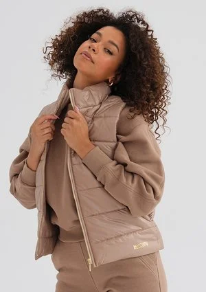 Prezentowany bezrękawnik nie tylko dopełni Twój look świetnym stylem, ale zaskoczy wysoką funkcjonalnością. Już teraz zaopatrz się w to ciepłe i miękkie cudeńko, które doskonale zachowa ciepło w newralgicznych partiach ciała. Bezrękawnik chroni przed chłodem i nieprzyjemnym wiatrem, jak i wilgocią – tkanina, z której jest wykonany to impregnowany, nieprzemakalny materiał wypełniony miękką watoliną. Okrycie jest komfortowo lekkie i nie krępuje ruchów. To świetny dodatek na okres przejściowy, a także na chwile chłodu, by szybko się rozgrzać, na przykład w pracy. Model posiada wysoką stójkę, dzięki temu ciepło osłania szyję. Prezentuje się bardzo elegancko, a to za sprawą kolorystyki beżu i złotych detali: loga i zamka. Najlepiej uzupełni komplety dresowe w beżowych i brązowych odcieniach.